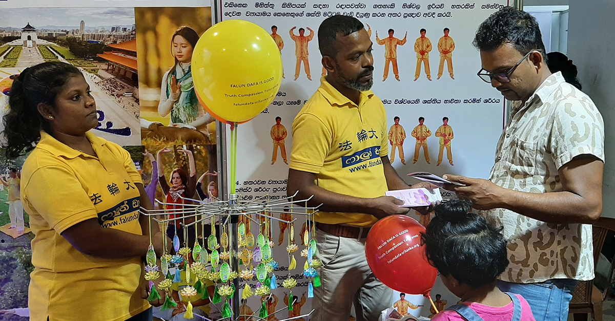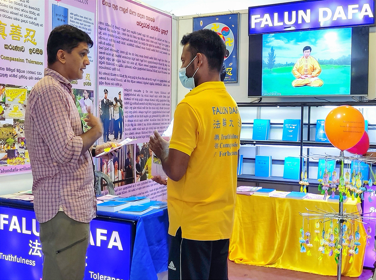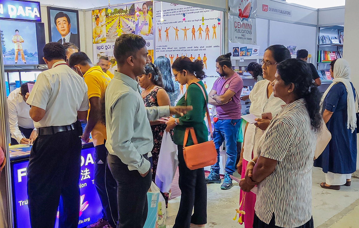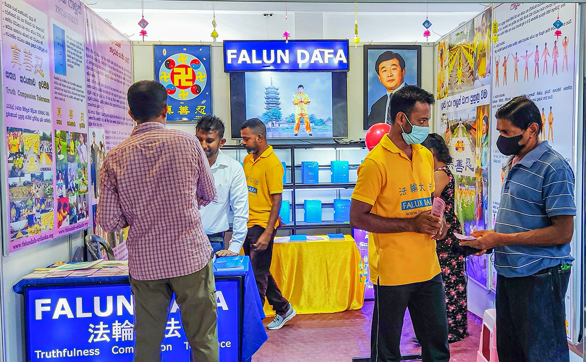 法轮功学员的展位布满了介绍功法的彩色展板。一台大电视机播放李洪志大师教授五套功法的视频,并展示了僧伽罗语、泰米尔语和英语版的法轮大法主要著作《转法轮》。