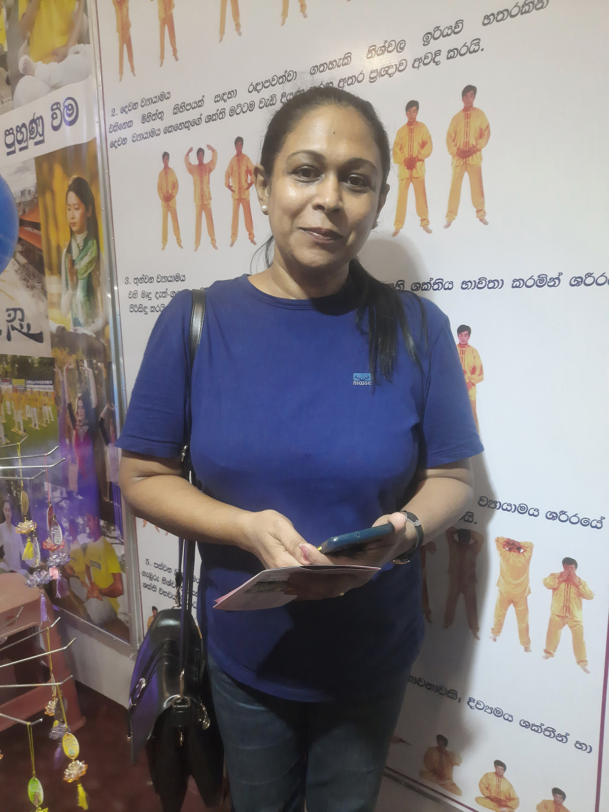 达玛延提·达马拉斯纳(Damayanthi Darmarathna)是一名教师,她被书展上法轮功学员的展位所吸引。在了解了法轮大法真、善、忍原则后,她相信法轮大法可以帮助她找到生活的平衡。她说:“其实,当我看到这个展位、展示布置并且阅读了展板详细内容后,我认为这对我来说非常有价值。”