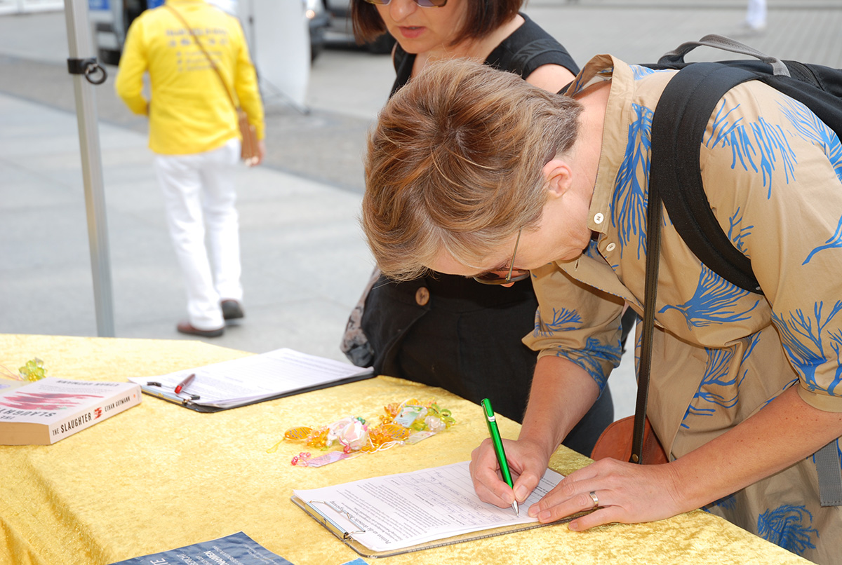 当她得知能用签名来支持法轮功学员反迫害时,赶紧走到了签字簿旁,“这太好啦!这个名我一定要签!”她还说:“真希望下次我还能在这里与你们相遇。”