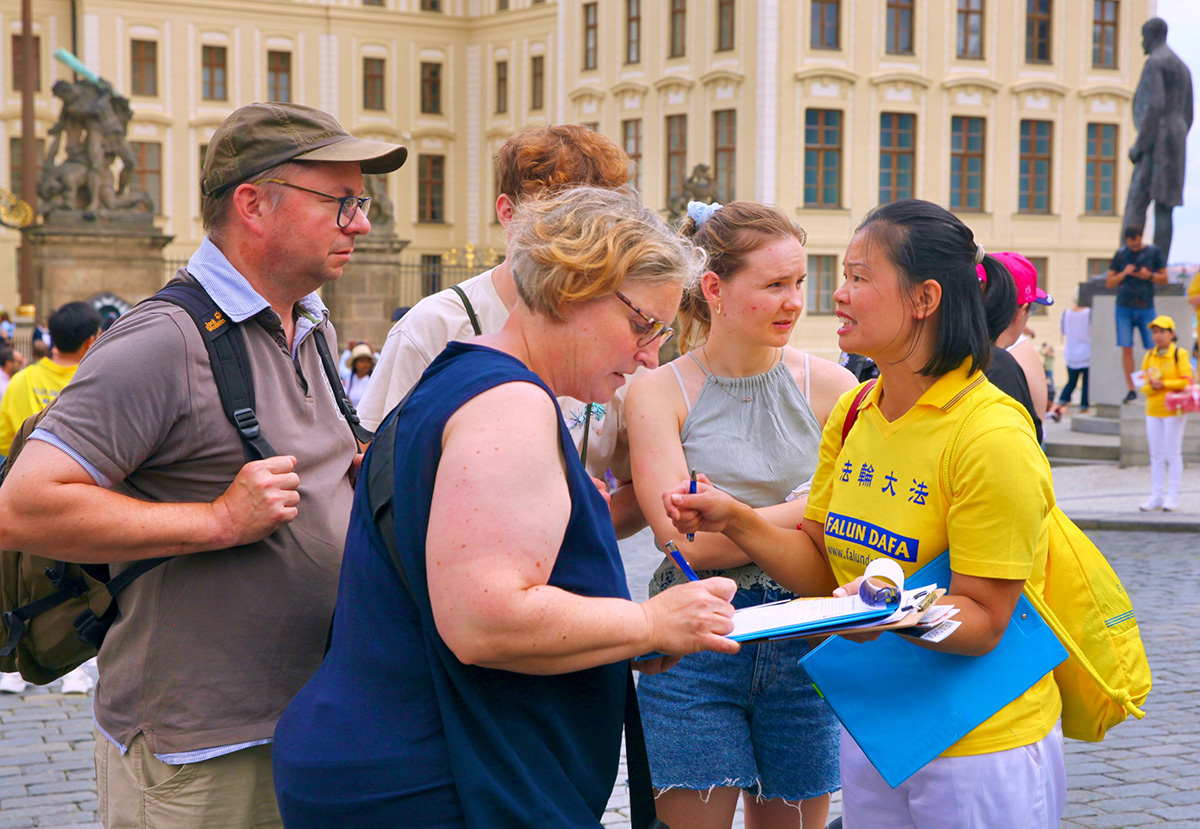 来自荷兰的罗斯女士(Ross)和伙伴签名声援法轮功学员反迫害,她们在瓦茨拉夫广场聆听法轮功学员的发言后,作出这一决定的。
