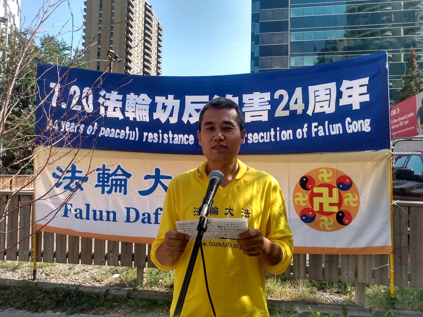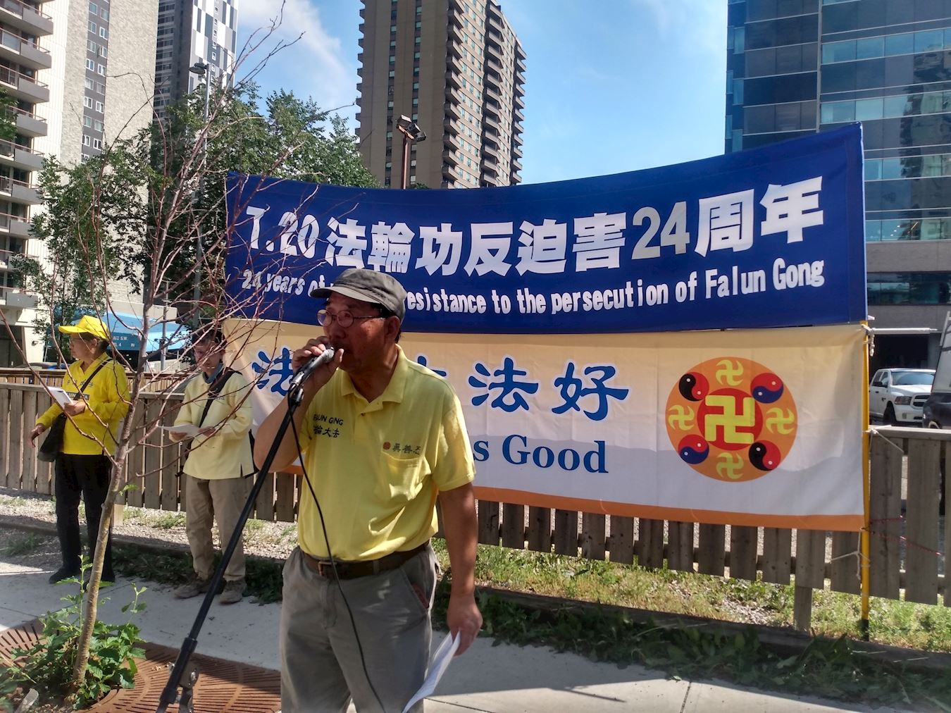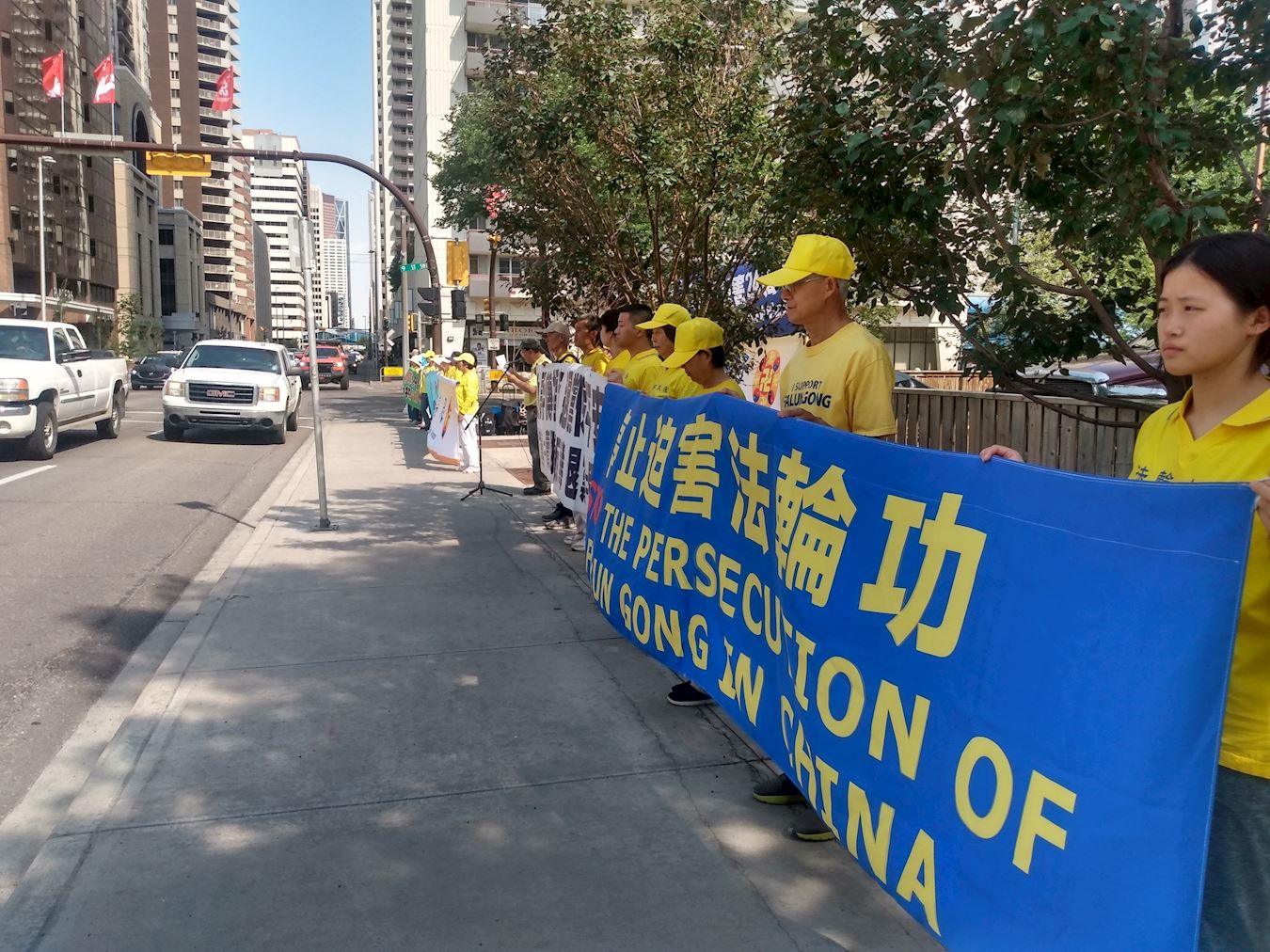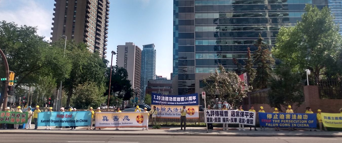 七月二十日下午,卡尔加里部份法轮功学员身着鲜黄色上衣在中领馆前集会,和平抗议中共对法轮功长达二十四年至今仍在继续的迫害。他们沿着大道,一字排开,手中的中英文横幅上写着“停止迫害法轮功”、“帮助制止活摘器官”、“退出中共保平安”、“解体中共结束迫害”等标语。
