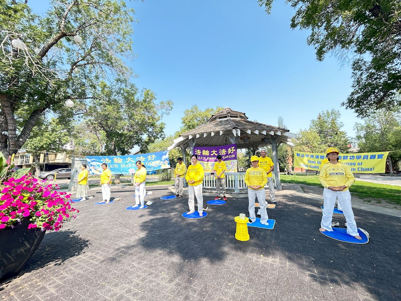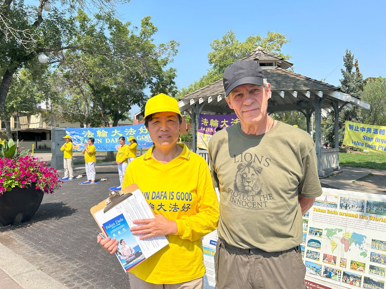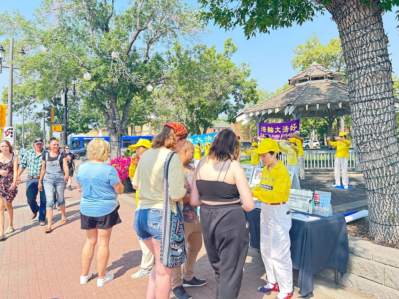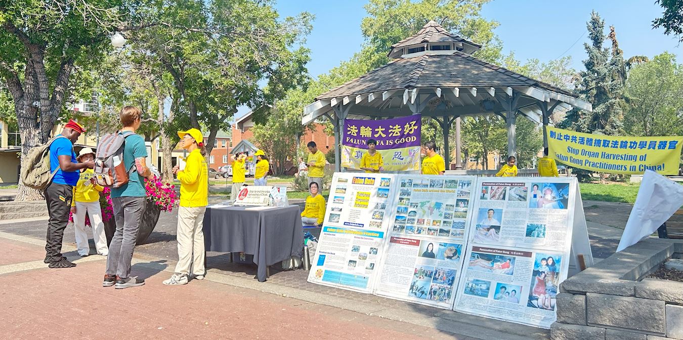 七月二十二日,埃德蒙顿部份法轮功学员在老斯特拉斯科纳农贸市场(Old Strathcona Farmer's Market)举行活动,纪念法轮功群体反迫害二十四周年。他们有的炼功,有的向路人讲真相,征集停止迫害和活摘的签名。