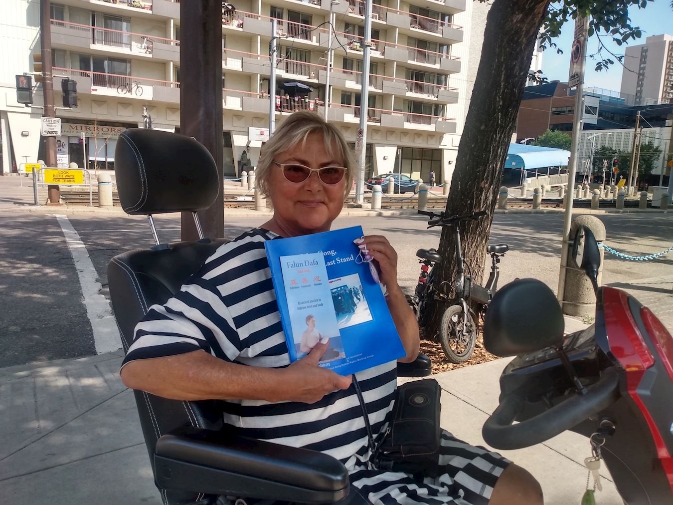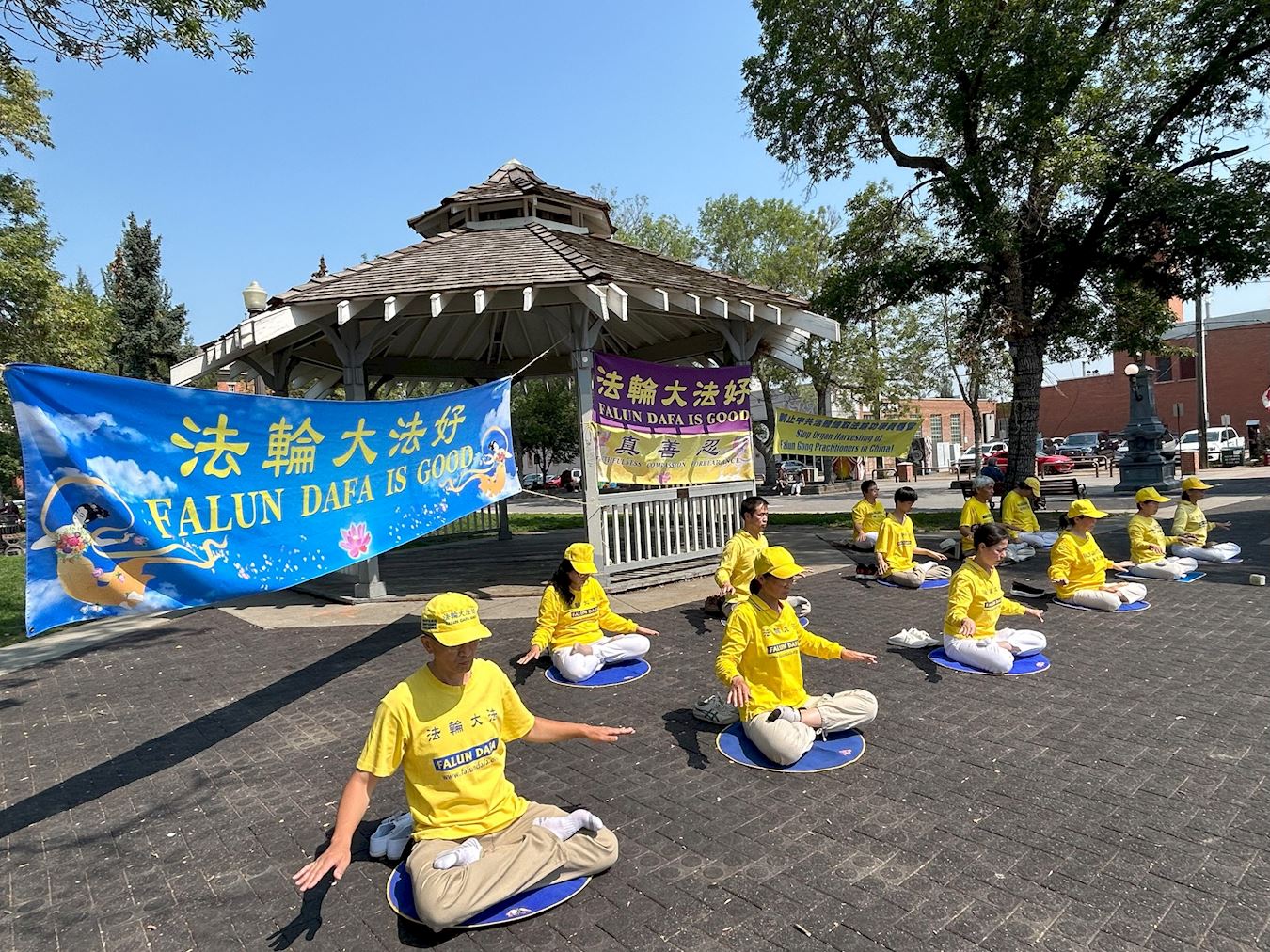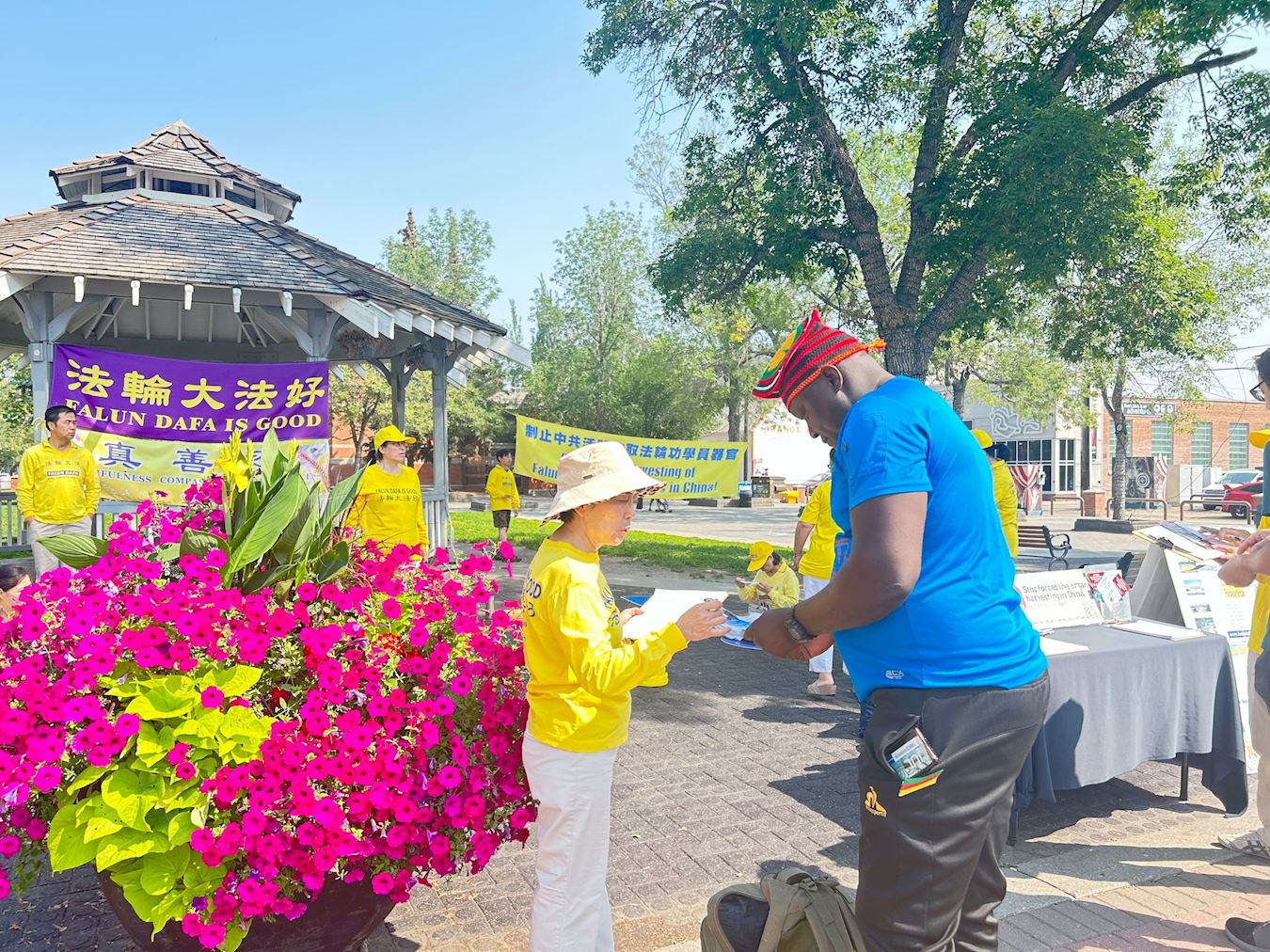 七月二十二日,埃德蒙顿部份法轮功学员在老斯特拉斯科纳农贸市场(Old Strathcona Farmer's Market)举行活动,纪念法轮功群体反迫害二十四周年。他们有的炼功,有的向路人讲真相,征集停止迫害和活摘的签名。