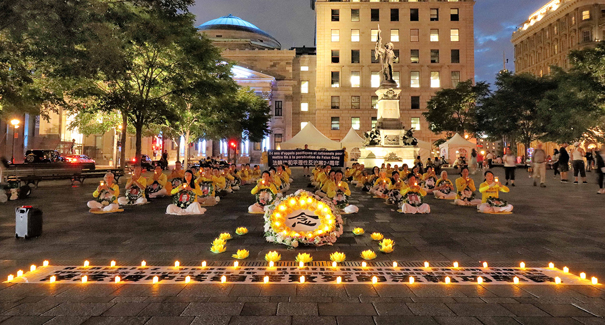 当晚,法轮功学员在蒙特利尔老城的兵器广场(Place D’Armes)举行烛光悼念活动。夜幕降临时,他们捧起手中点燃的蜡烛,表达对为坚守正信而被中共迫害致死的同修的思念。黑暗中的点点烛光,守护着人们心中的善良,照亮未来的希望的路。