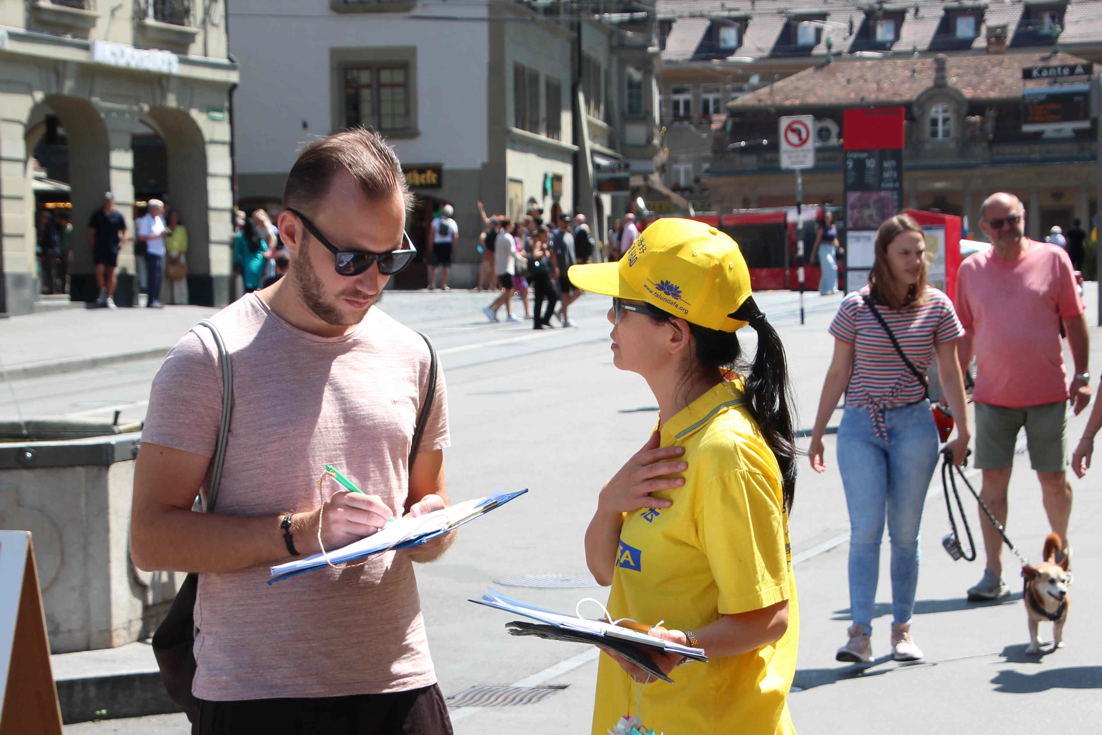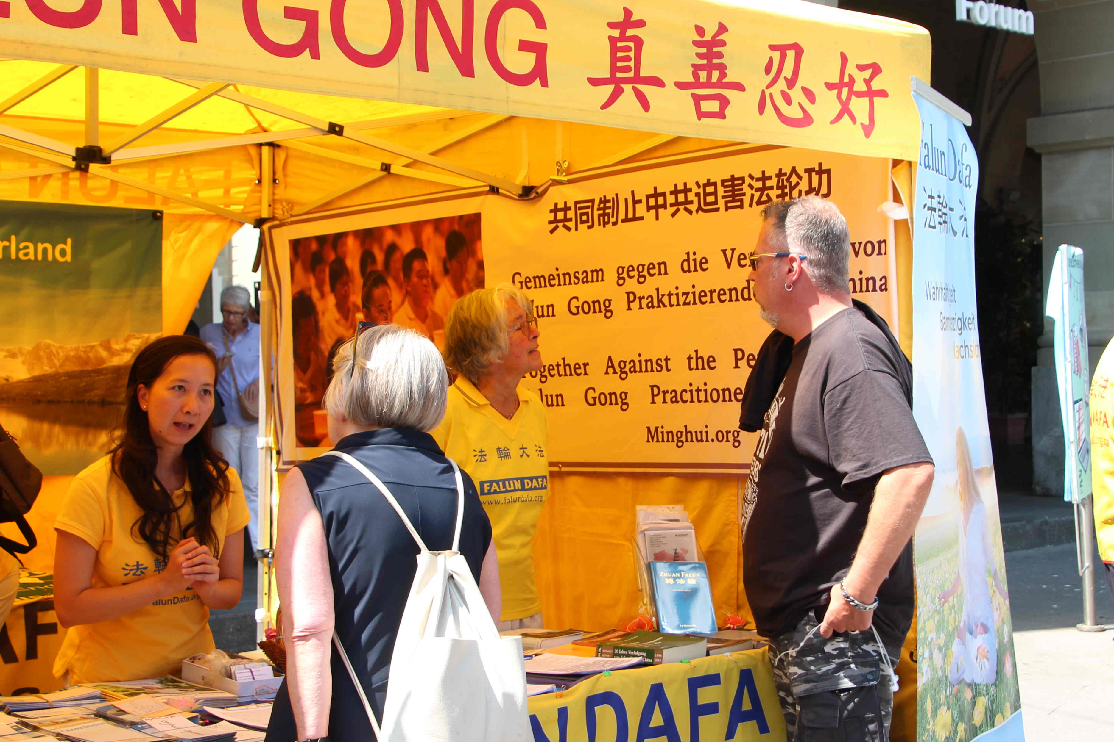 下午在伯尔尼市中心的控豪斯(Kornhaus)广场集会上,学员们再次通过功法演示、演讲及发送真相传单,告诉路人法轮功是什么,揭露中共迫害法轮功学员,特别是活摘法轮功学员器官的罪行。