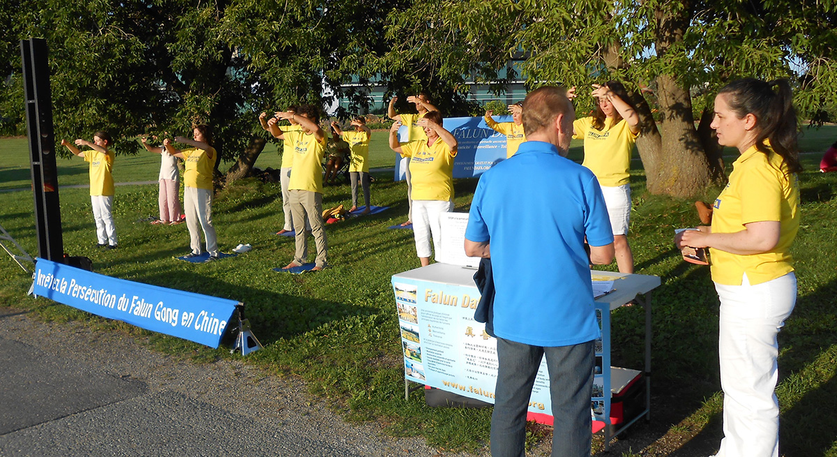 当天公园里有节日活动,一些民众在等待燃放烟花。一位先生询问法轮功学员在做什么。法轮功学员玛丽-皮埃尔(Marie-Pierre)向他解释了法轮功是什么,并告诉他,发生在中国对法轮功持续至今的残酷迫害。当学员们开始集体炼功时,这位先生认真观看,并说炼功音乐让人放松。他不仅在呼吁制止迫害的征签表上签名,而且拿着征签表帮忙征集签名,最后离开的时候,还不忘问坐在附近长凳上的另一位先生有没有在支持法轮功学员反迫害的征签表上签名。