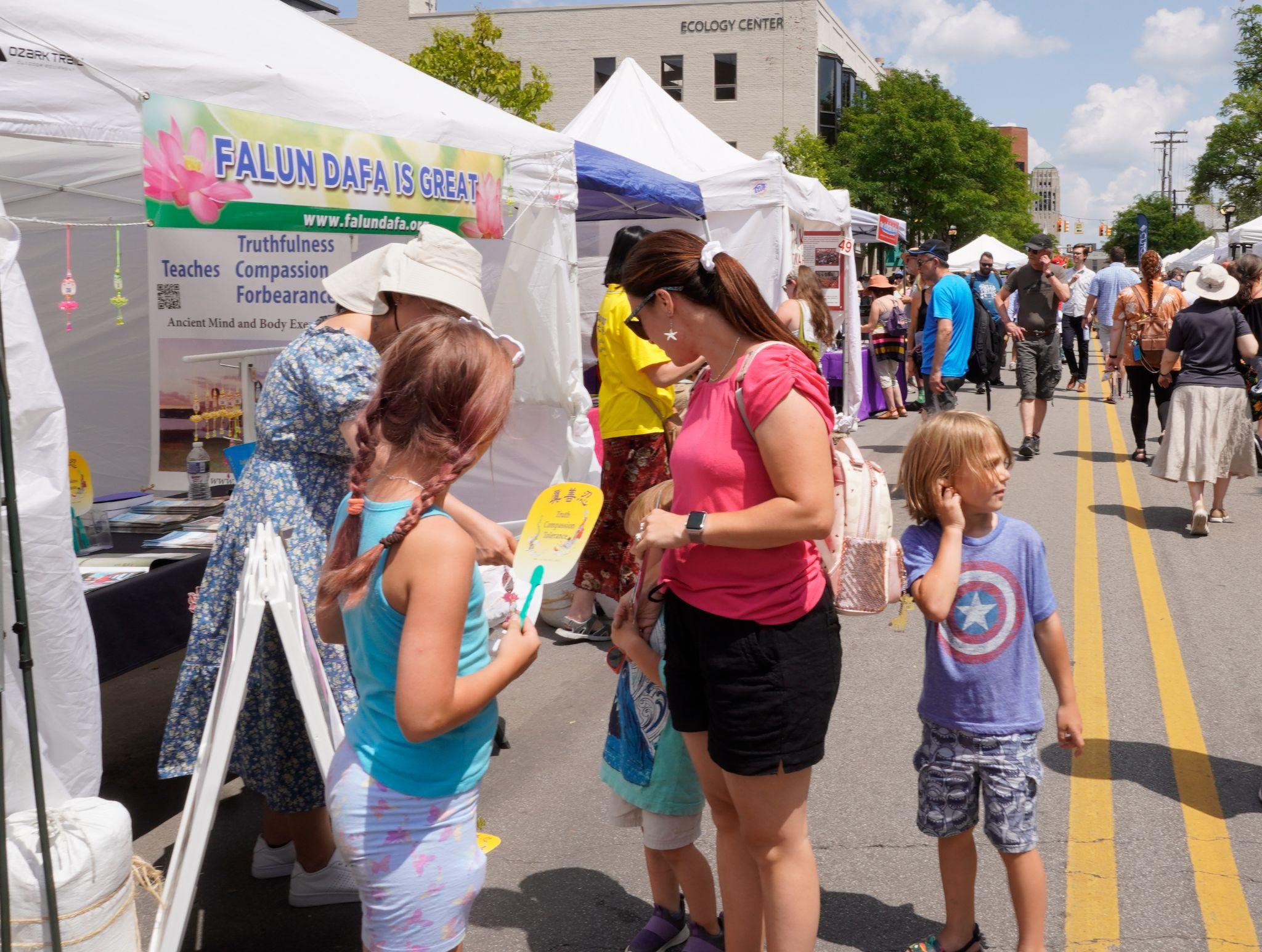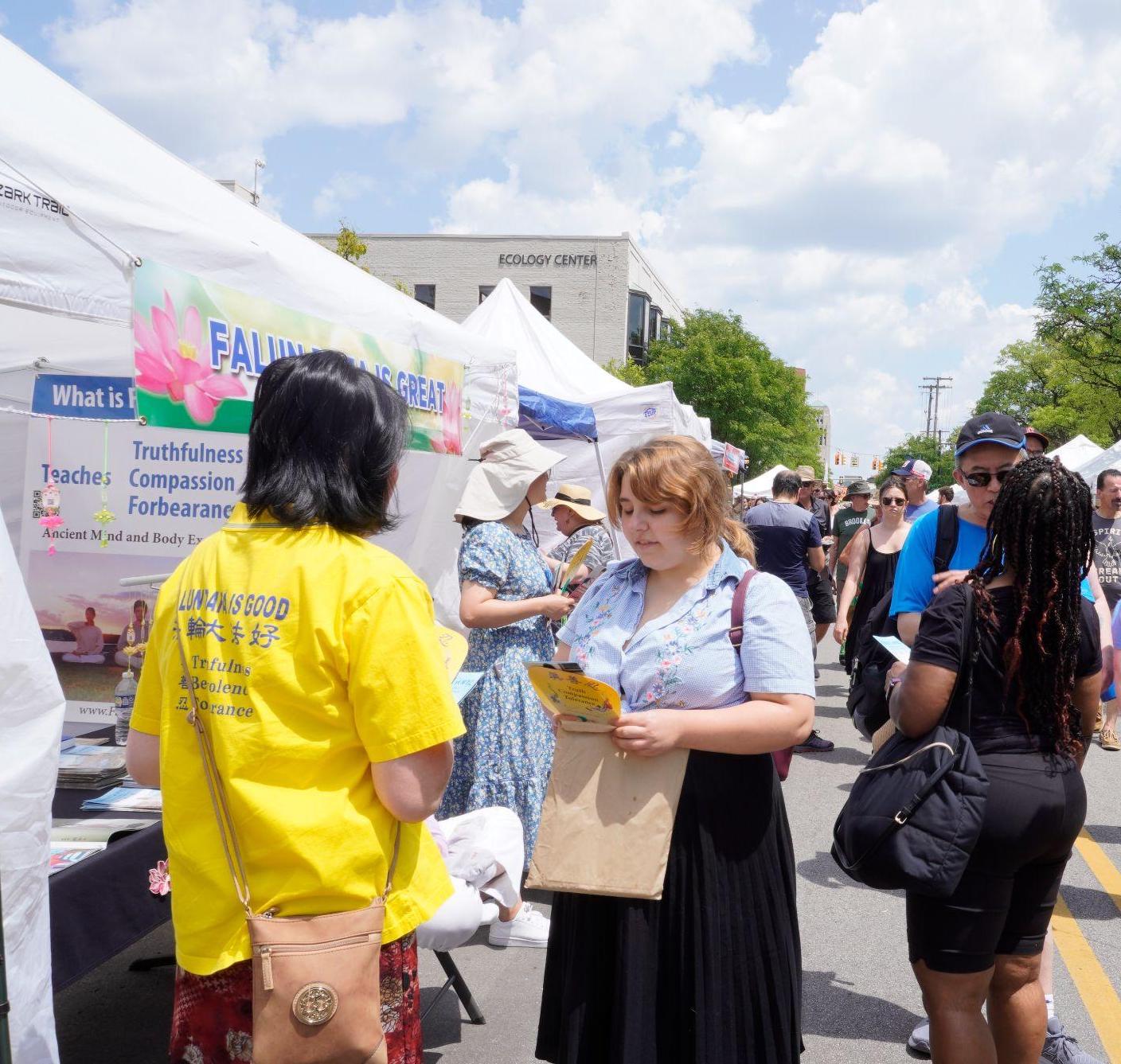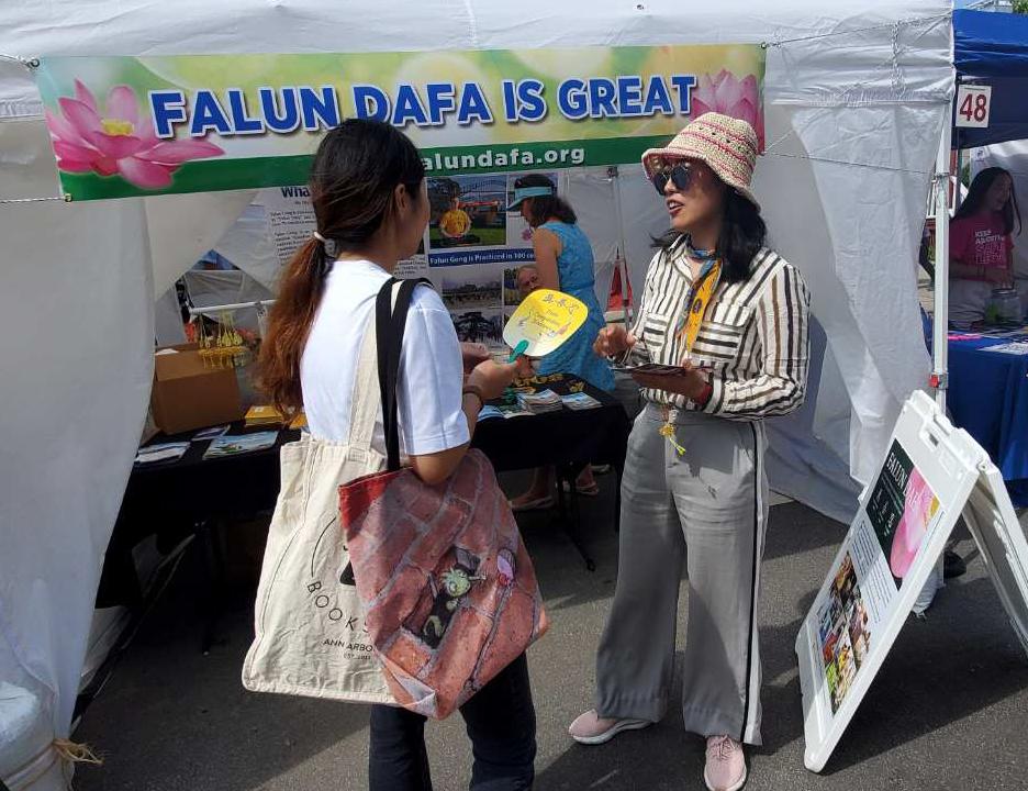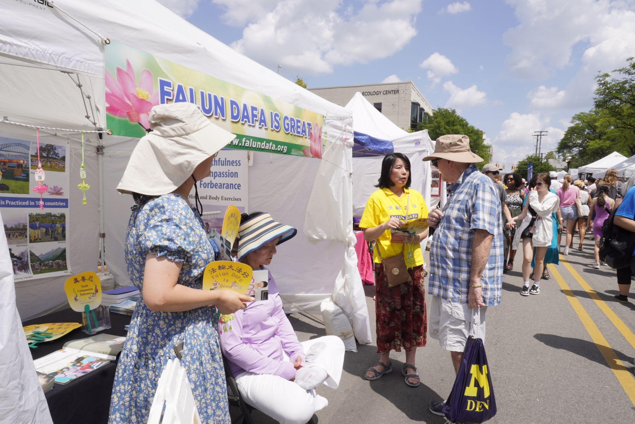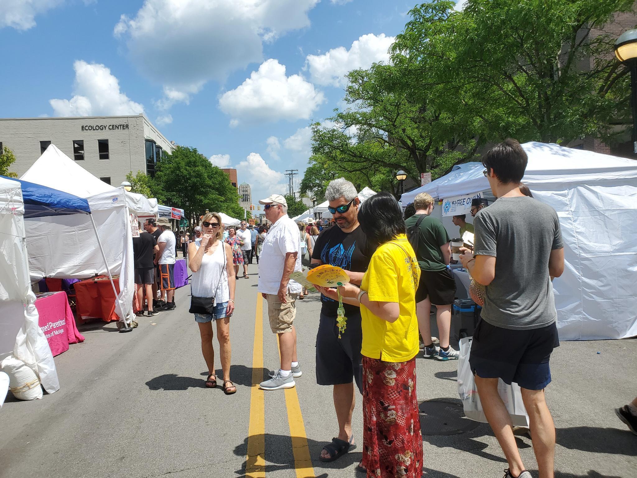 二零二三年七月二十日至二十二日,密西根州“安娜堡艺术博览会”在安娜堡(Ann Arbor)市举行。参展的一千多个帐篷展位延绵三十多个街区,展区的每一条街道上人群熙熙攘攘,热闹非凡。当地的法轮功学员每年都参加博览会,让更多的民众了解法轮功。宁静祥和的炼功场面也吸引了很多人驻足。