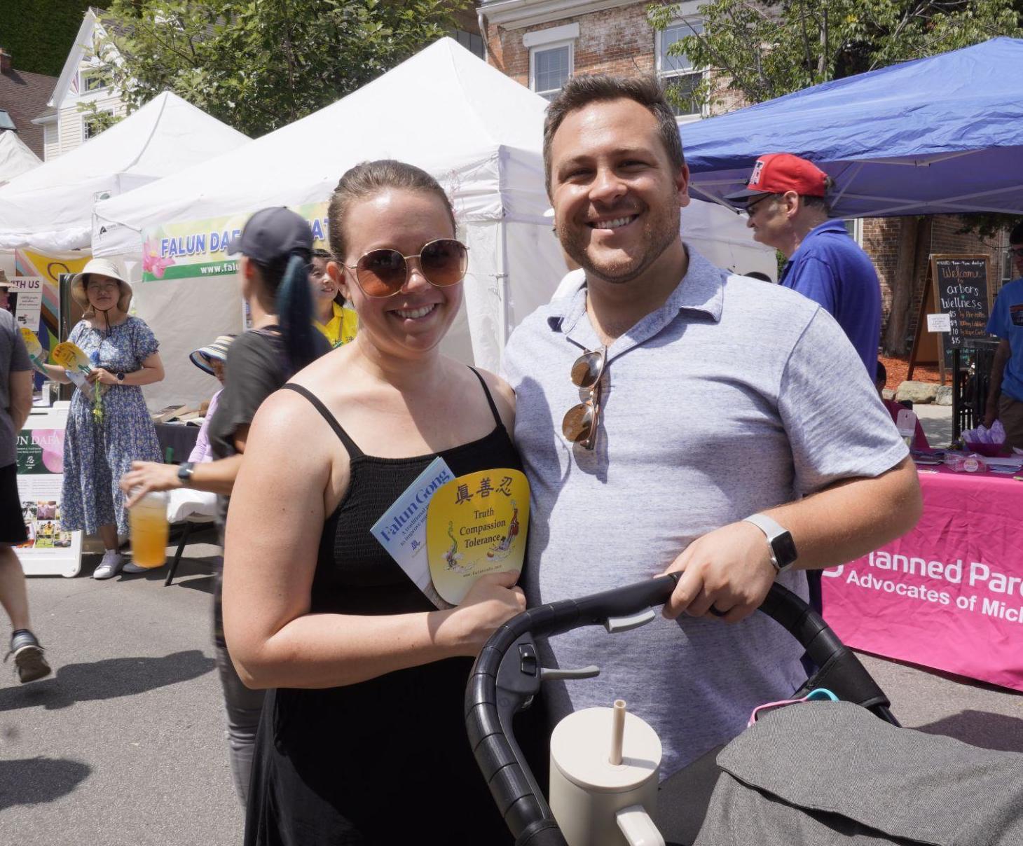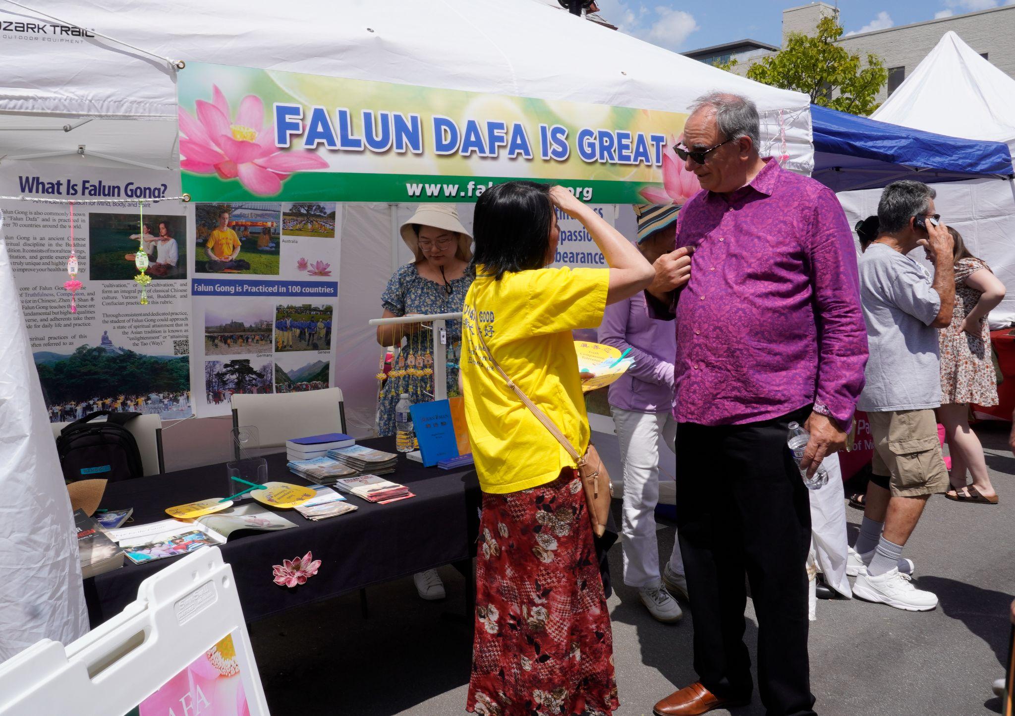 在法轮功的展位,她表示这是她第一次听说法轮功,特别是当她了解到法轮功遵循真、善、忍的原则时,她说:“这是三个非常美好的词。她让我们在繁忙的生活中,放慢脚步来思考。来审视我们自己。”