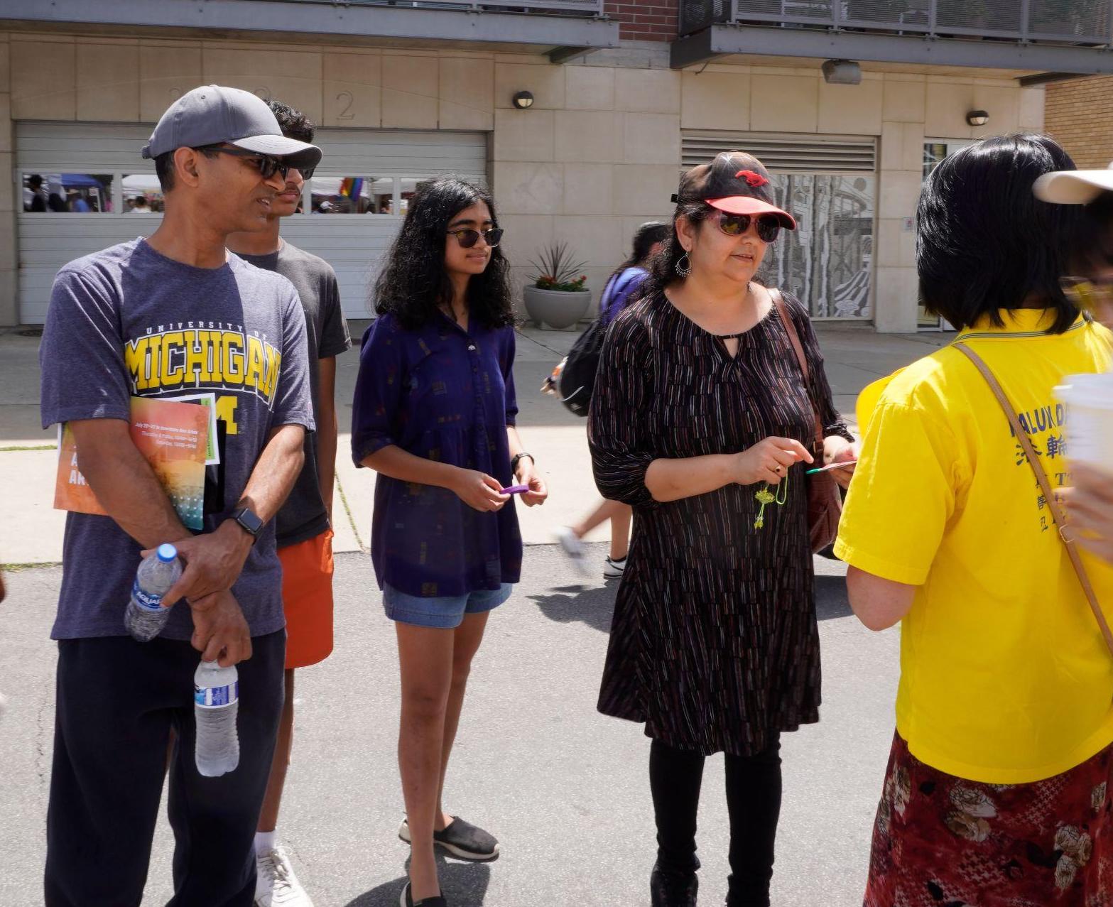 ![]() 图7:密西根大学退休讲师麦格雷(右一)正在和法轮功学员交谈。 |