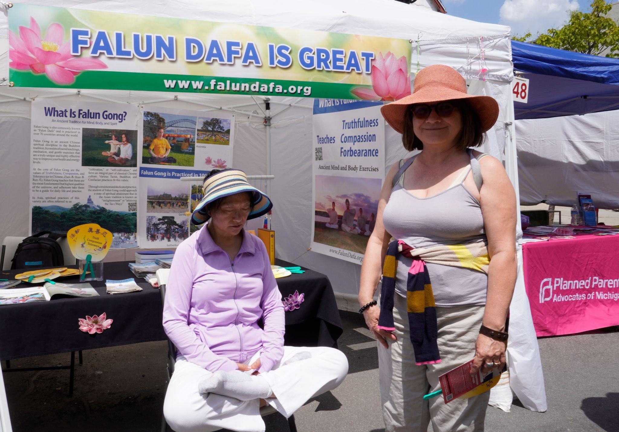 “她吸引了我的目光,她看起来是那样平静,我正在寻找打坐方法。”金·阿道夫(Kim Adolph)看到法轮功学员在展位前盘腿打坐时,她喜悦地说道。