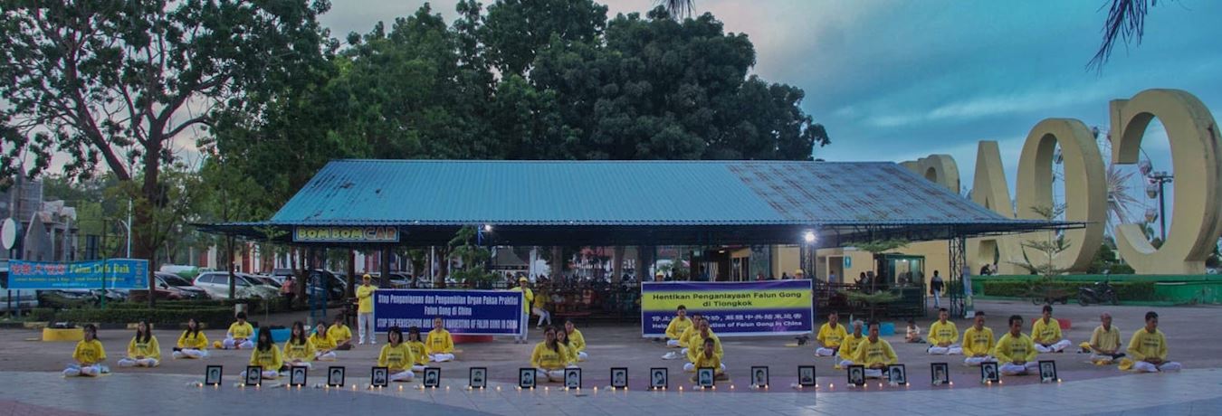 在炼功后,学员们举行了烛光夜悼活动,悼念那些坚持信仰而遭受迫害并失去生命的学员。他们还打出了两幅巨大的横幅,呼吁停止在中国对法轮大法修炼者的迫害和强摘器官。
