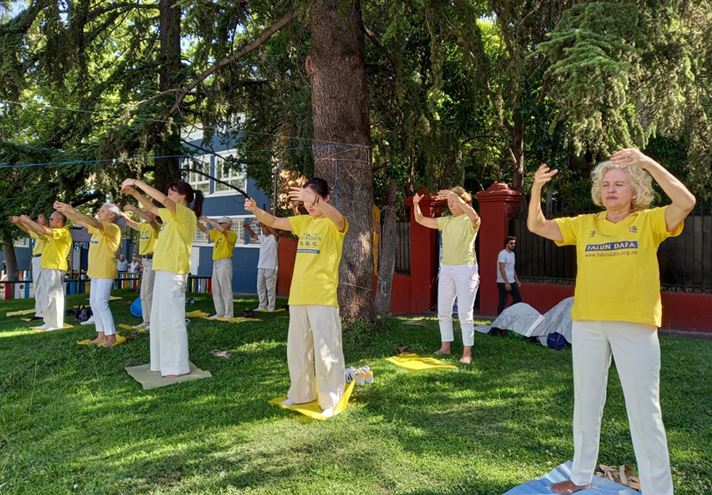 法轮功学员在中使馆对面展开一长排横幅及图片展板,揭示了中共对法轮功学员实施酷刑和非法关押的暴行。部分法轮功学员随着祥和的炼功音乐演示法轮功的五套功法,向民众展示法轮功的美好,并向来往经过的路人讲述法轮功真相。许多路人在了解真相后,毫不犹豫地签署了反迫害请愿书。