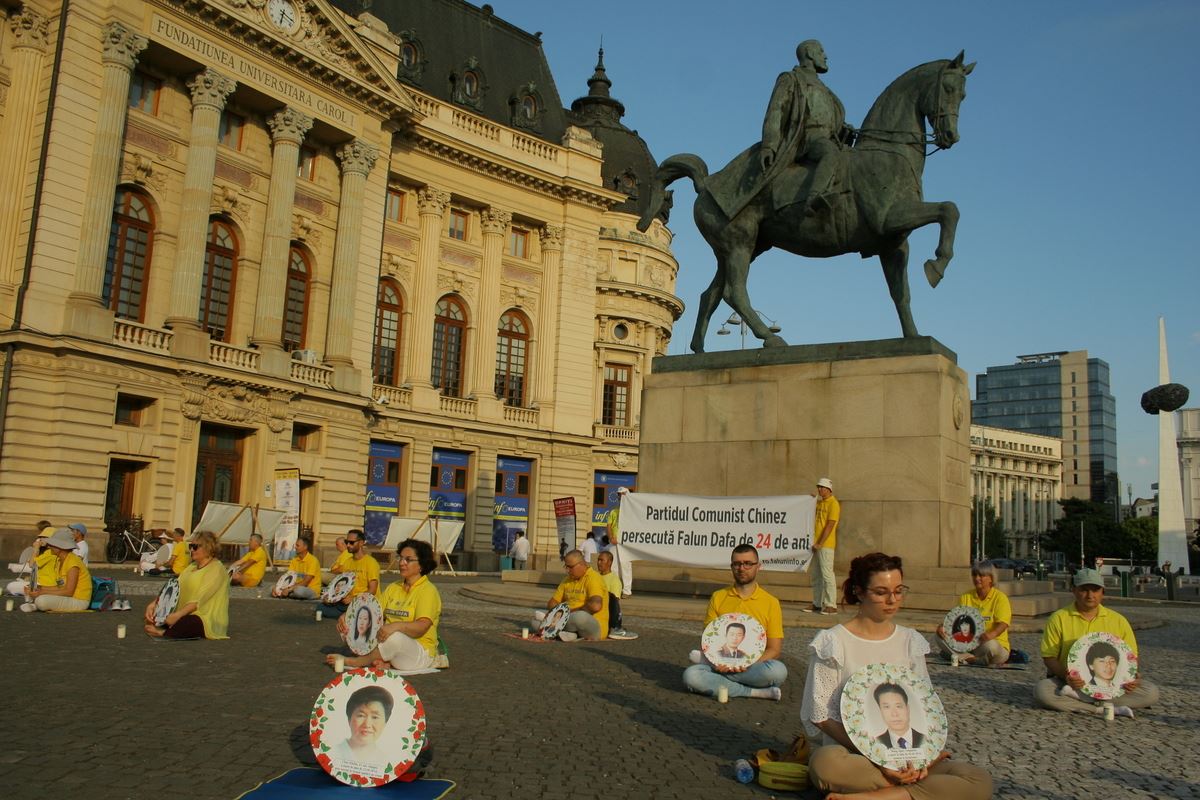 七月二十一日晚,学员们在卡罗尔一世国王雕像旁的胜利路(Calea Victoriei)举行了烛光夜悼活动,他们手持被迫害离世的学员的肖像,默默静坐悼念。