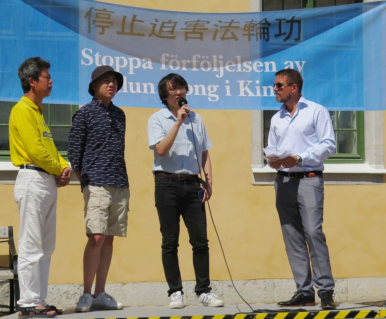 一位驻瑞典外交官在活动现场听了很久,事后与学员交谈。他表示希望更多了解法轮功,并感谢学员在这里做的一切。