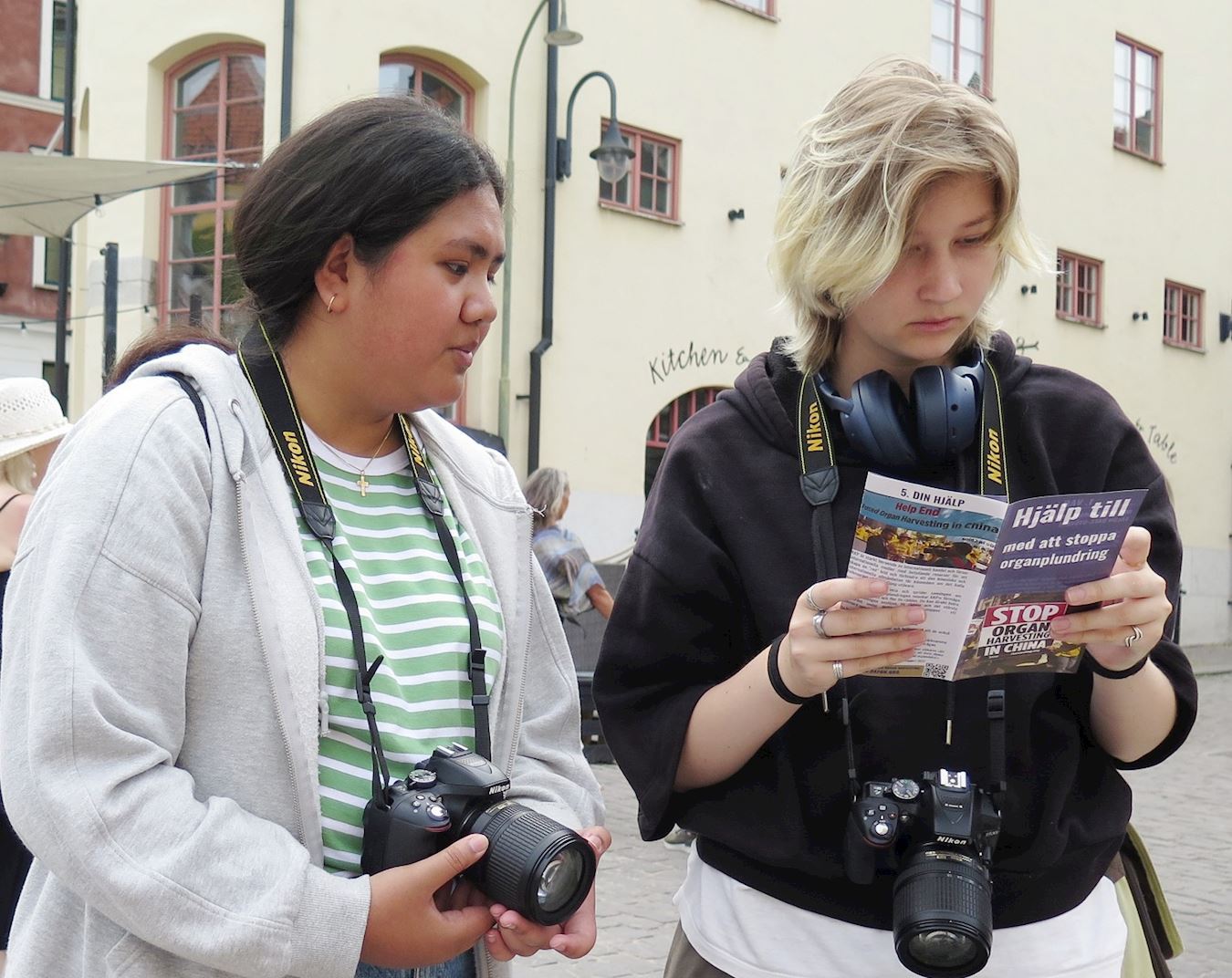 ![]() 图7:传媒学生埃尔维拉·奥尔伯格(Elvira Årberg,右)和丹妮拉·迈鲁胡(Daniela Mailuhu)阅读揭露中共活摘法轮功学员器官真相资料 |