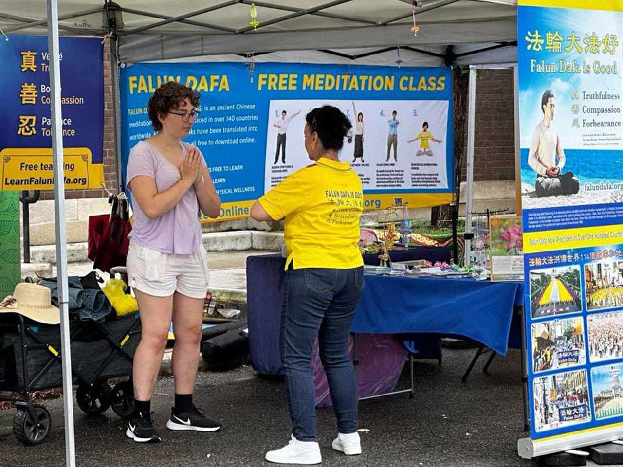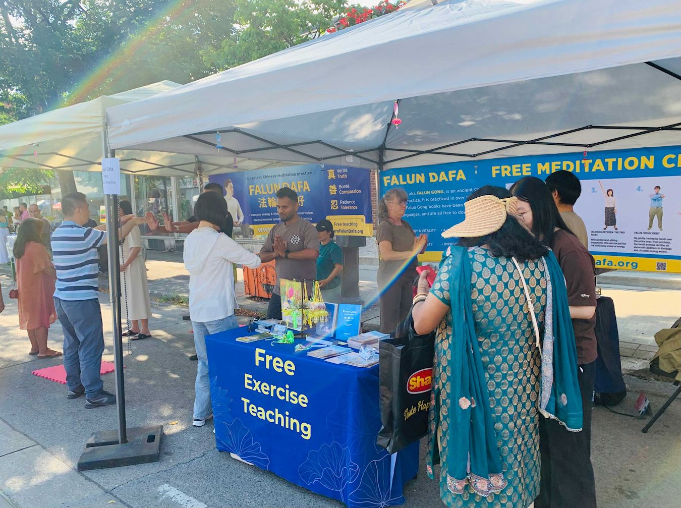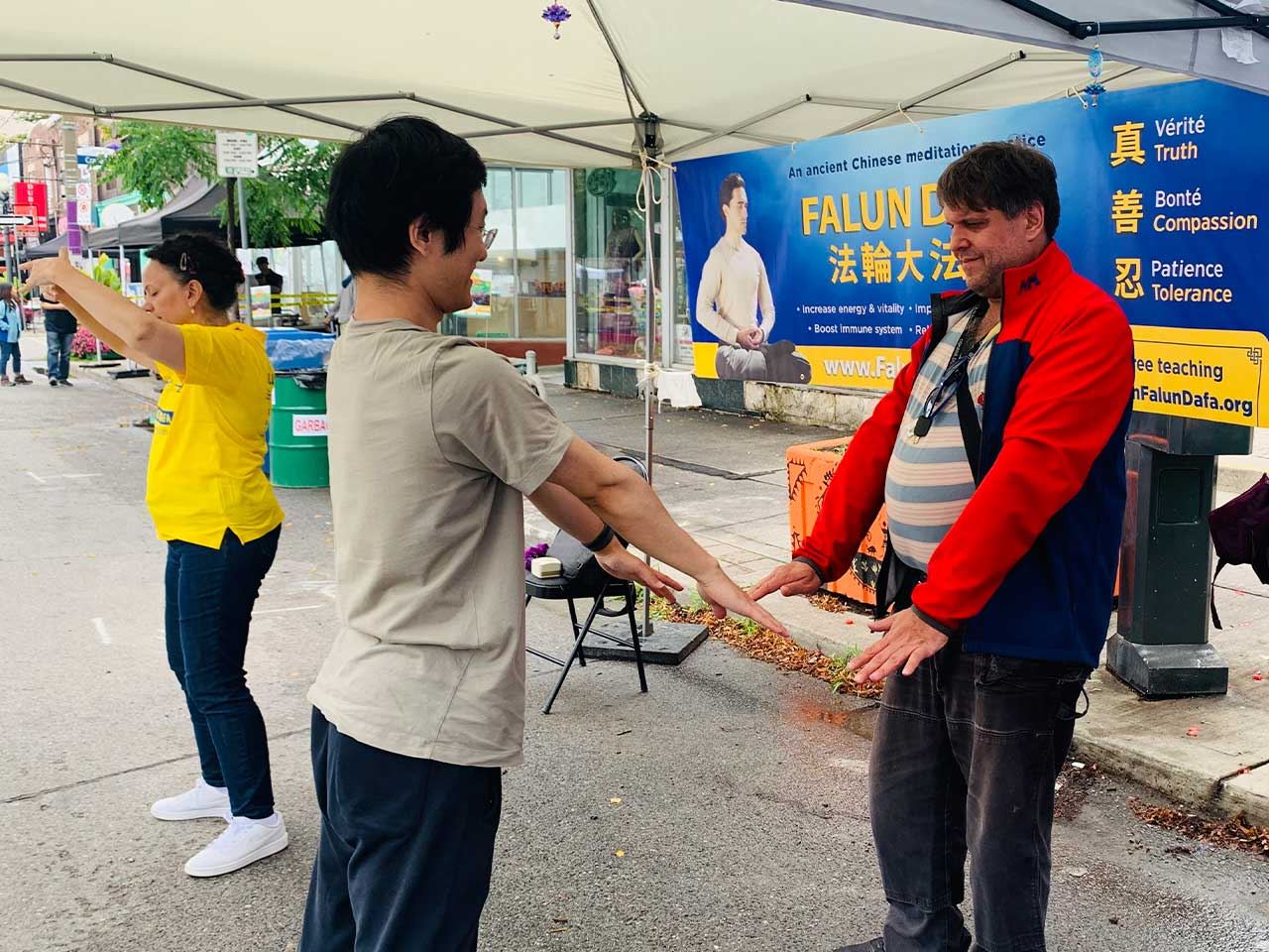 法轮功学员在活动上设立展位。参展者对功法有着浓厚的兴趣,展位的两个帐篷里常常站满了人。因为不停有人要学功,在场的学员们依次教他们,都忙不过来。其他活动的主办方看到法轮功学员的展位,也很喜欢,邀请学员也去参加他们的活动。一些华人也陆续来到展位,现场做了三:退.。