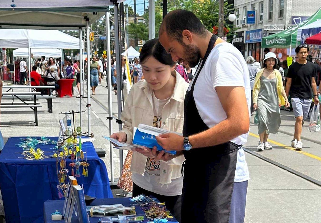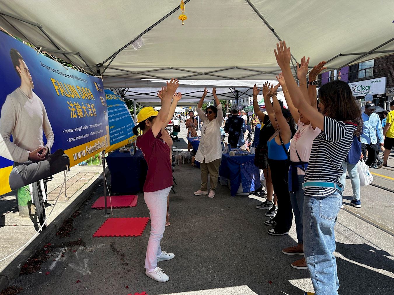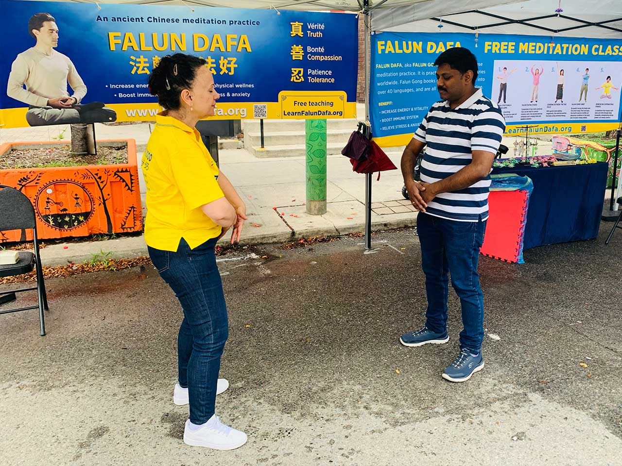 法轮功学员在活动上设立展位。参展者对功法有着浓厚的兴趣,展位的两个帐篷里常常站满了人。因为不停有人要学功,在场的学员们依次教他们,都忙不过来。其他活动的主办方看到法轮功学员的展位,也很喜欢,邀请学员也去参加他们的活动。一些华人也陆续来到展位,现场做了三:退.。