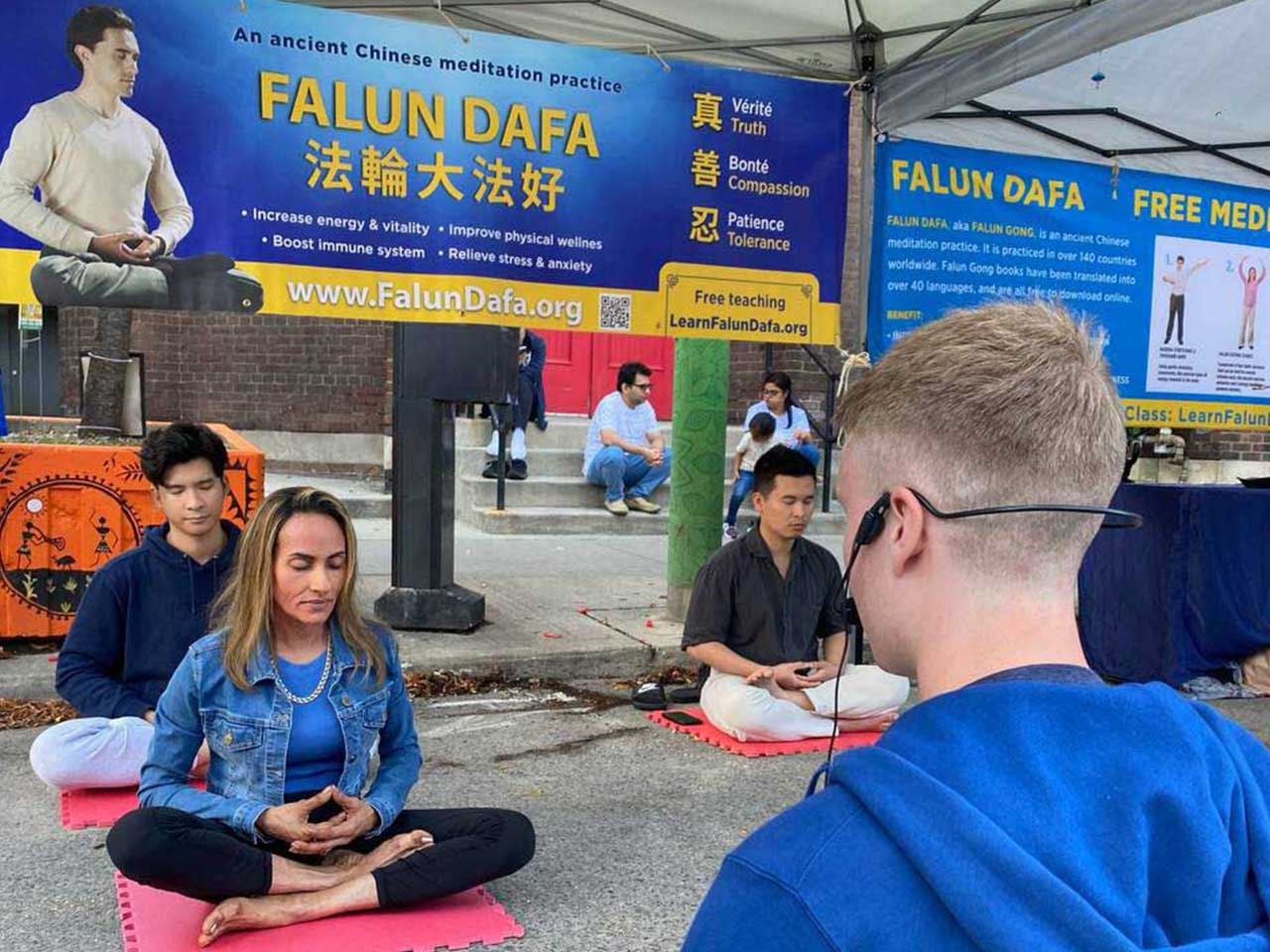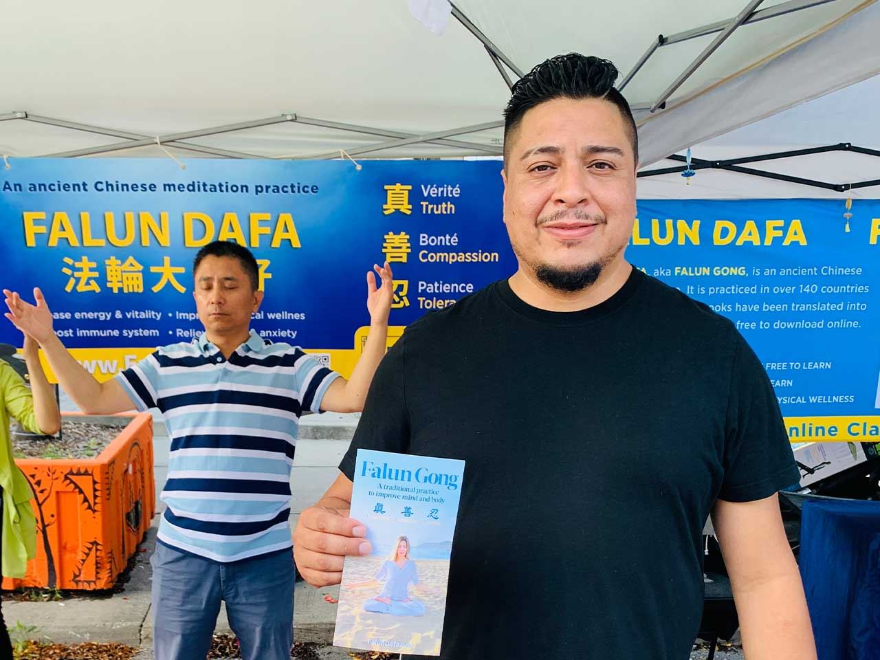 他说,“我之前就多次听说过法轮大法,还偶遇过户外炼功的学员。我对功法很感兴趣,尤其是打坐,所以一看到展位就想要来学。”