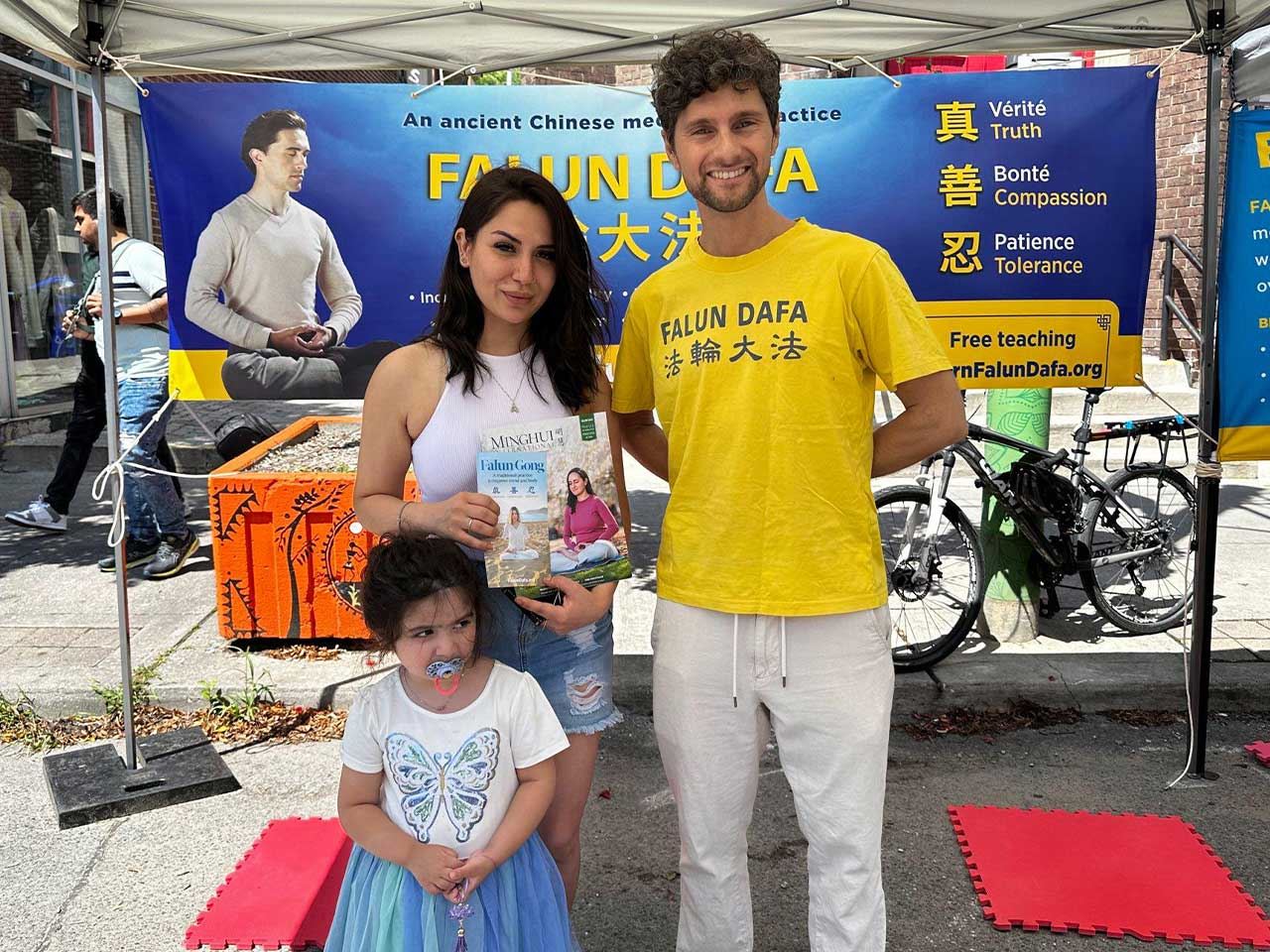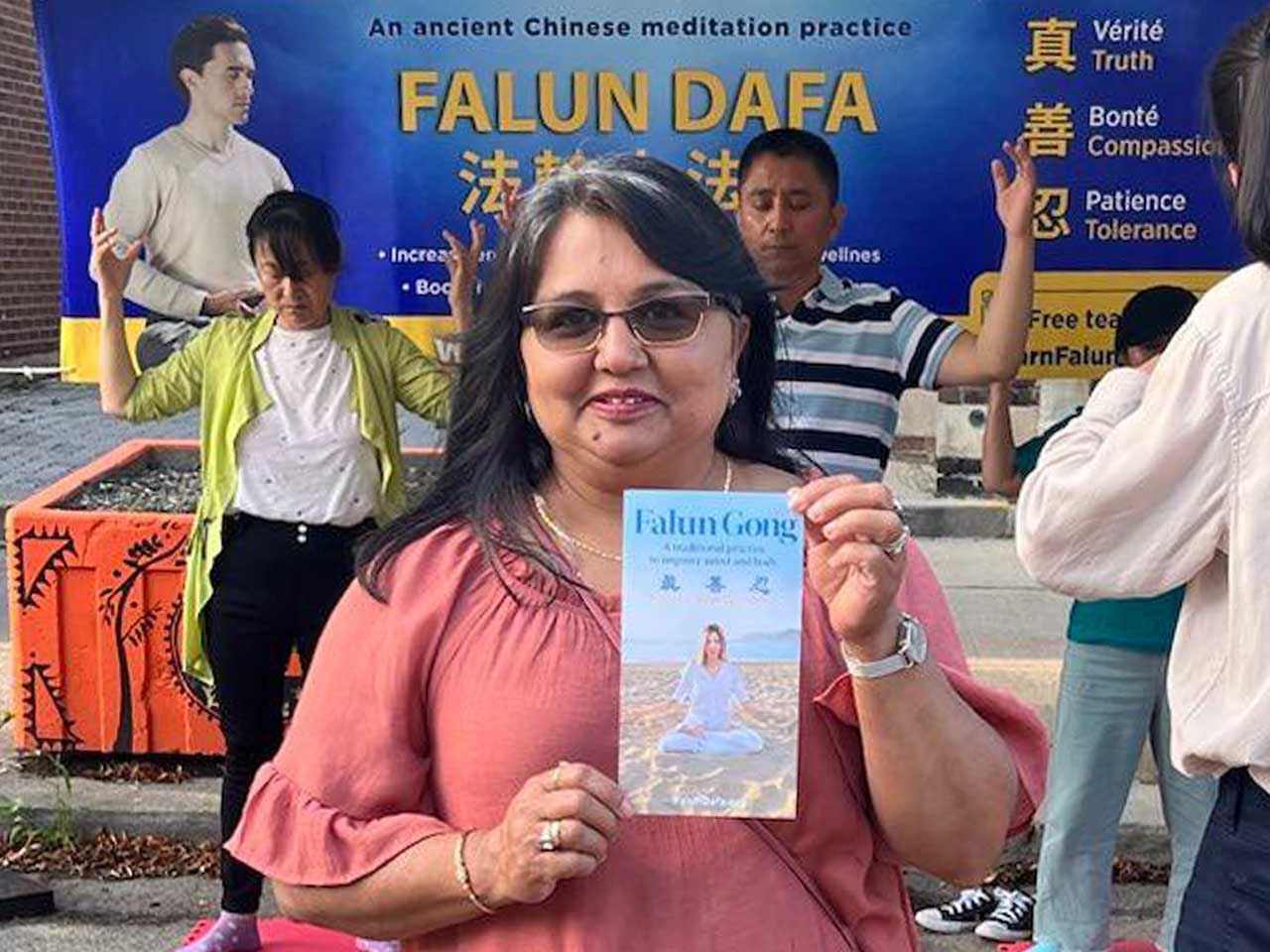 索菲亚(Sophia)是三个孩子的妈妈。她之前在公园看到过学员炼法轮功,当时就想学。今天看到法轮功展位,正好有机会学功。