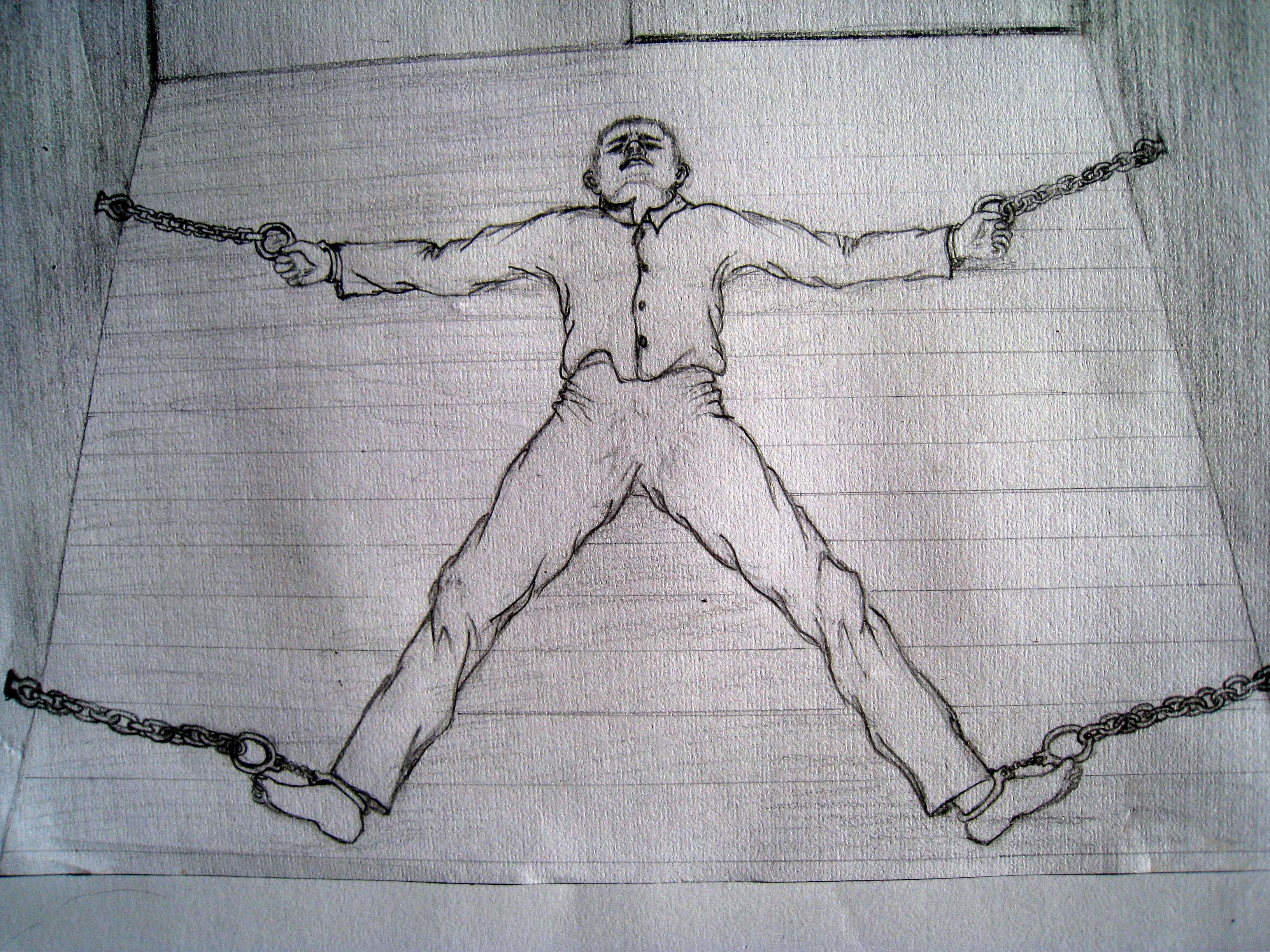 “上大挂”在凌源市看守所叫“挂板”。“挂板”就是四肢定位,在一个长两米、宽一米半的胶合板上,四个角分别固定上铁链子,把人的四肢固定在铁链子上,一动不能动,非常痛苦。