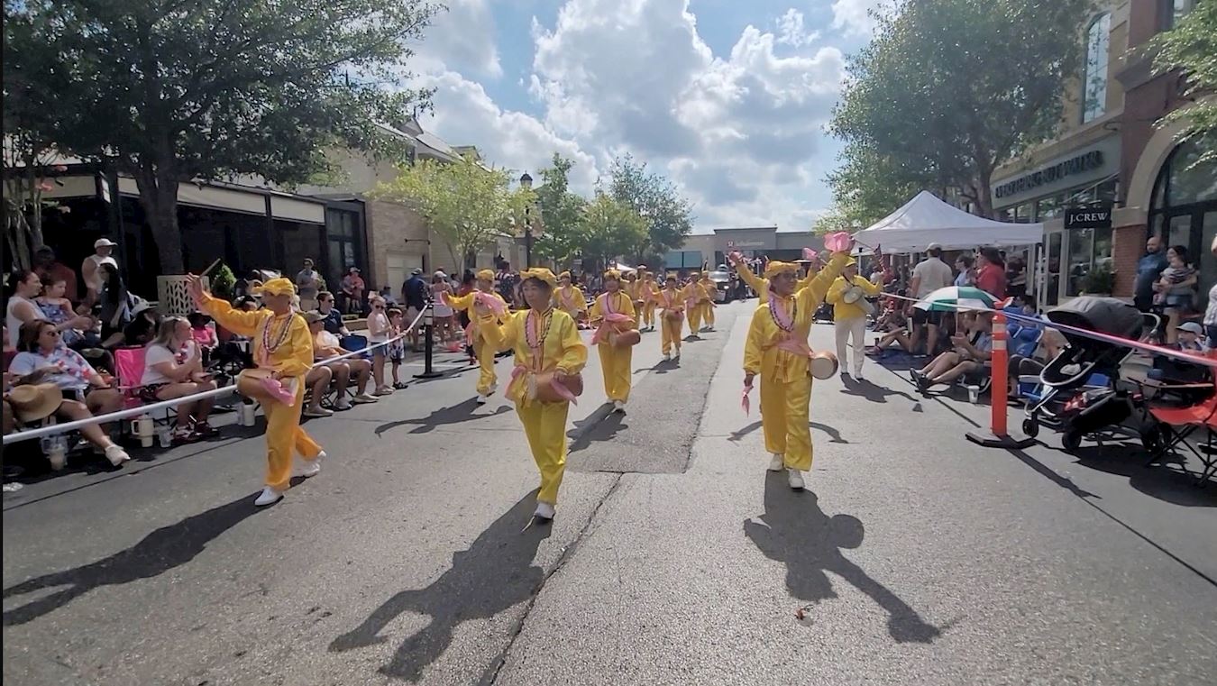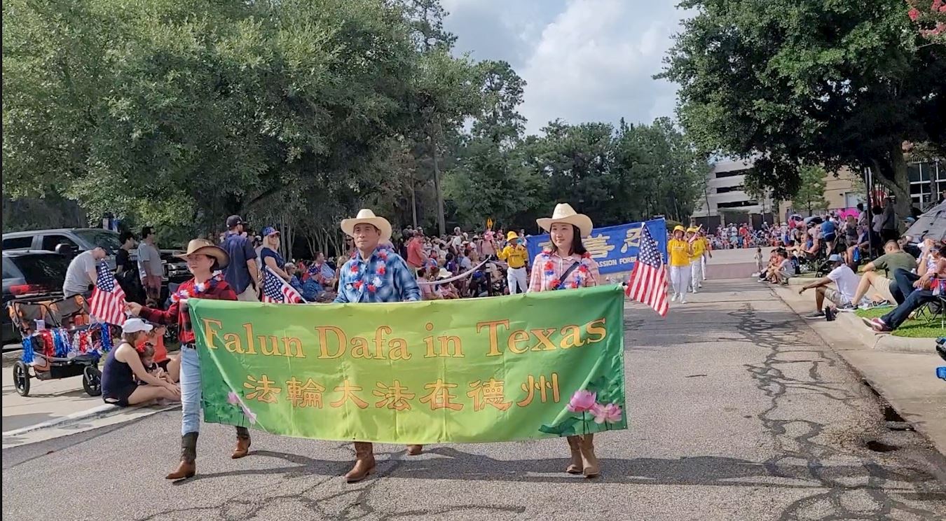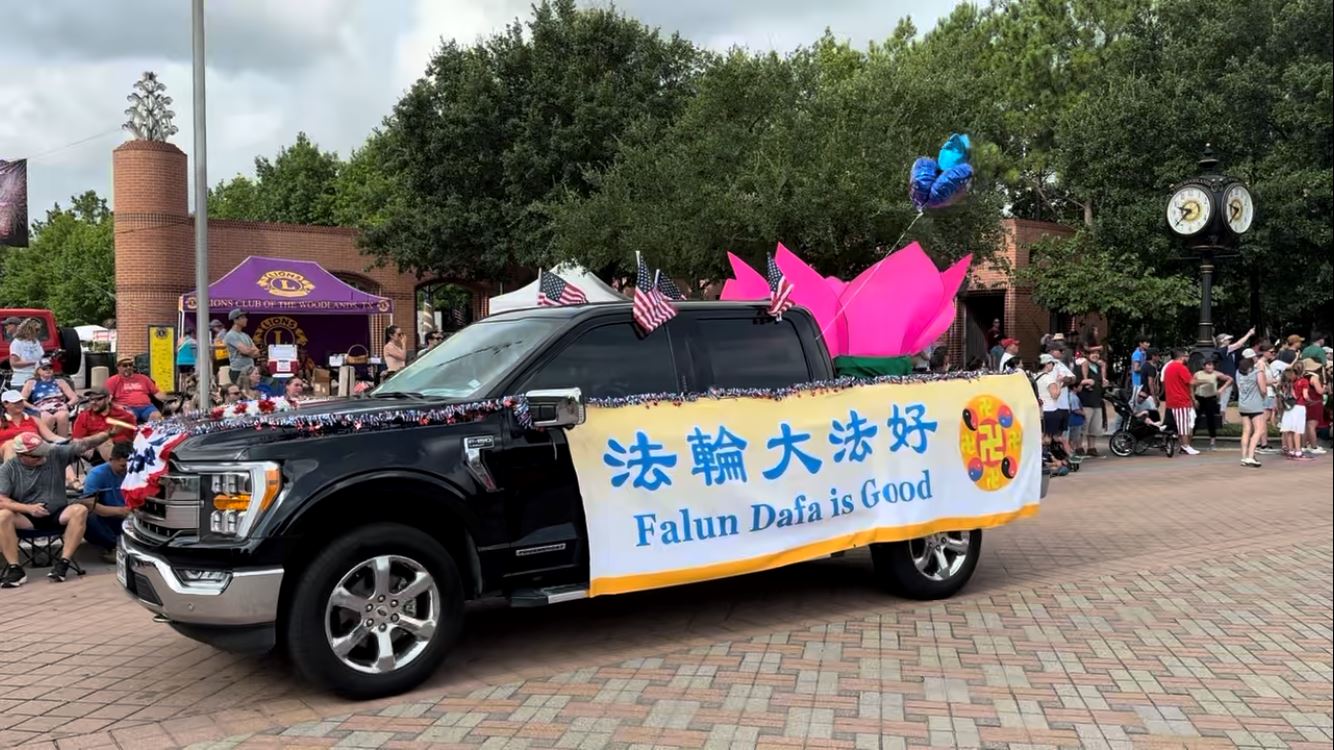 当天清晨,阳光明媚,鲜花盛开,在最繁华的伍德兰购物中心外,各游行团体盛装出席,载歌载舞,热闹非凡。法轮功队伍以“法轮大法在德州”和“真善忍”横幅打头阵,随后是功法展示、花车和腰鼓队。学员们或身穿德州当地牛仔装,或着黄衫,身上佩戴红白蓝三色国庆装饰,整支队伍平和又有气势。