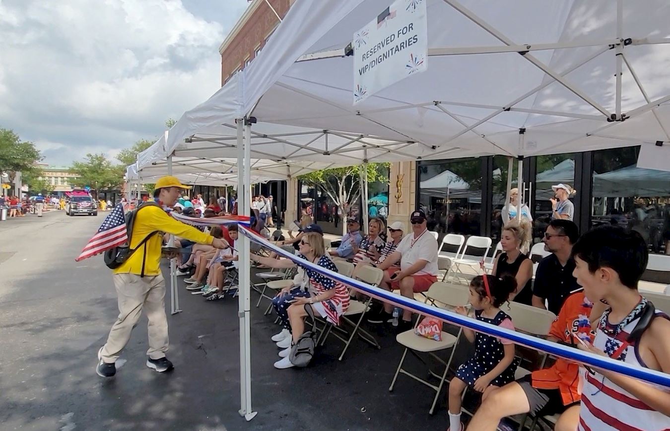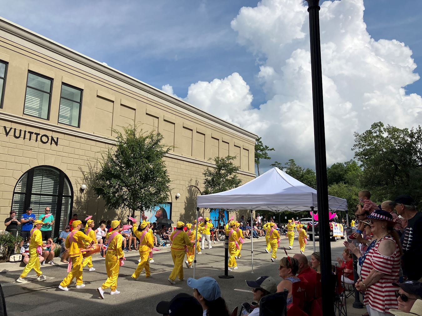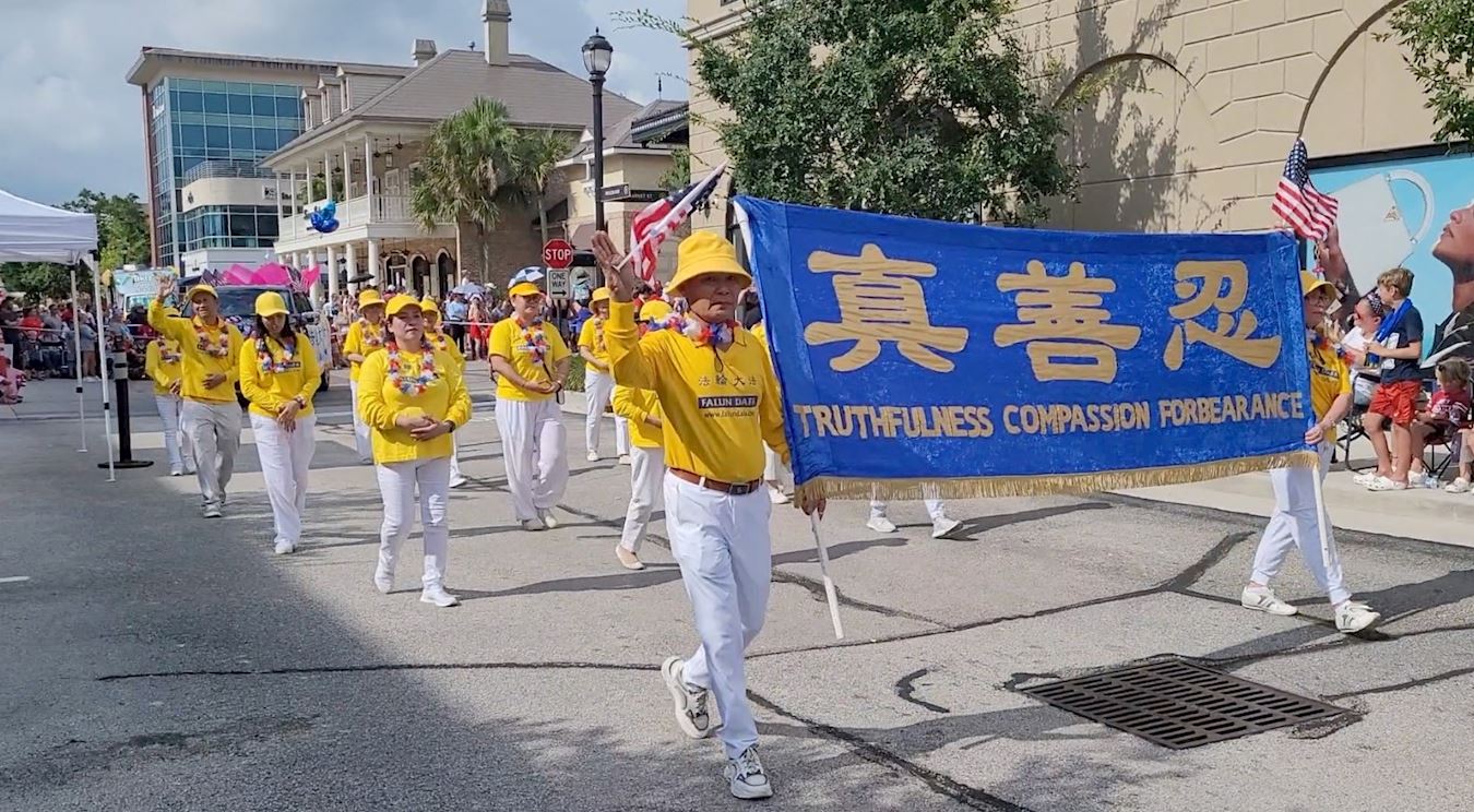 当天清晨,阳光明媚,鲜花盛开,在最繁华的伍德兰购物中心外,各游行团体盛装出席,载歌载舞,热闹非凡。法轮功队伍以“法轮大法在德州”和“真善忍”横幅打头阵,随后是功法展示、花车和腰鼓队。学员们或身穿德州当地牛仔装,或着黄衫,身上佩戴红白蓝三色国庆装饰,整支队伍平和又有气势。