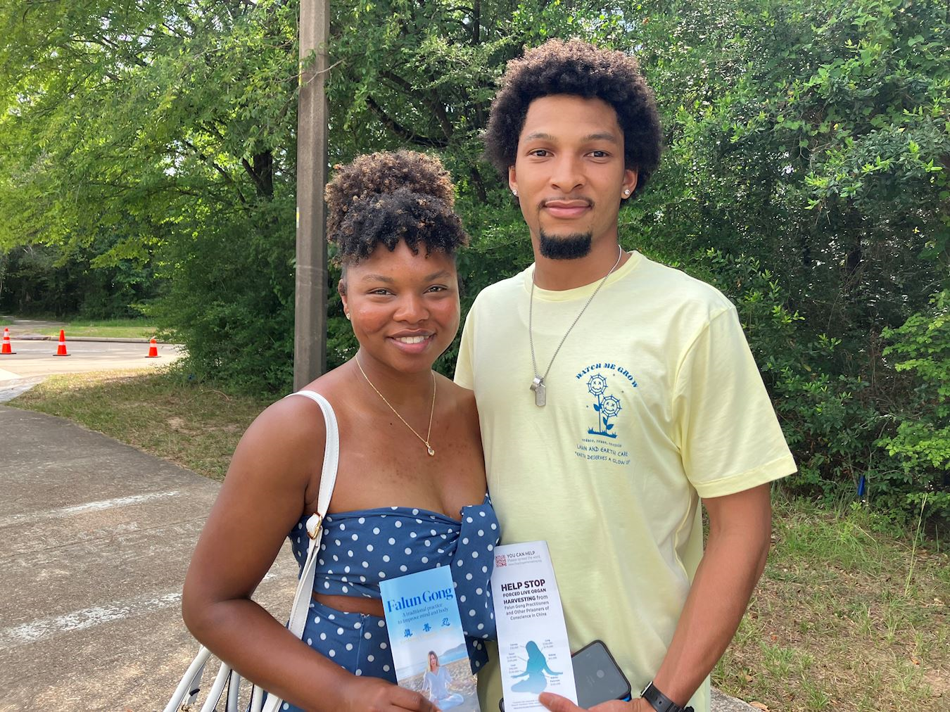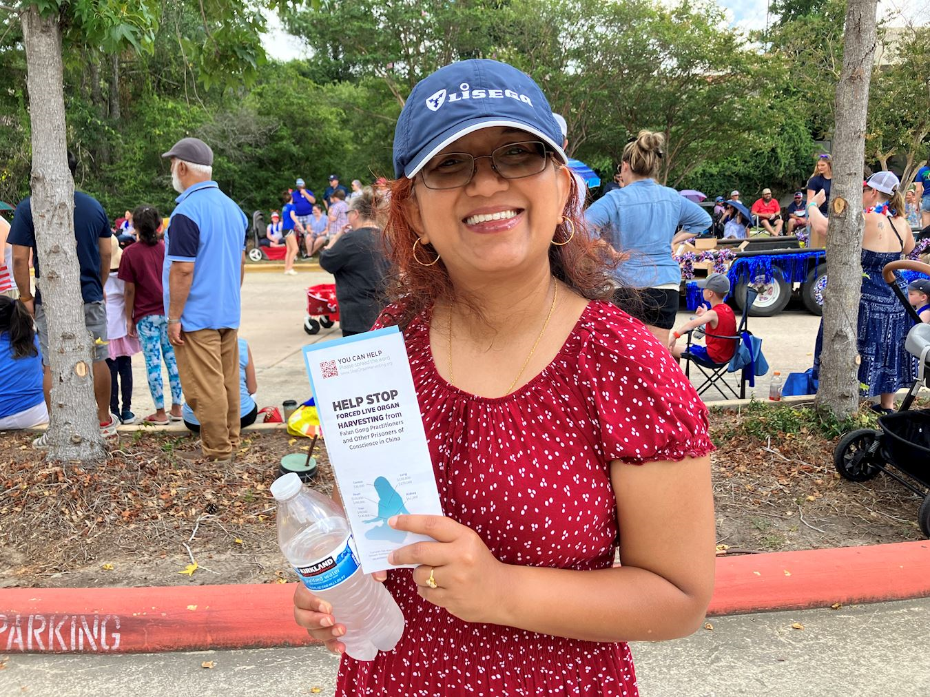 塔尼娅(Tanya)刚刚从新泽西来到德州,正好赶上这次游行活动,她看到法轮功的信息非常兴奋,很赞同“真善忍”的价值,她说:“法轮功对身心都有益,这太好了,我需要他。”