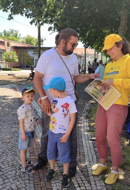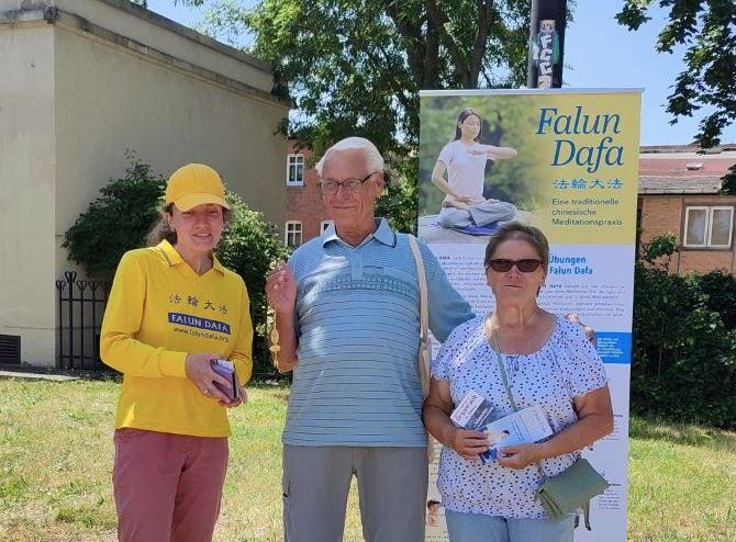 七月一日星期六是德绍市(Dessau)的城市节(Stadtfest),法轮功学员在市中心搭起了真相点。真相点的前面是一个购物中心,后面是通往其它摊位的通道。人们从四面八方走来,都会经过真相点。因此,一整天有很多游客和当地居民观看了功法演示,不断有人和学员交谈,了解真相。
