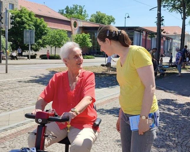 一位坐在电动代步车上的女士主动找到法轮功学员。她介绍说自己已经八十七岁了,就住在瑙姆堡。学员给了她一朵有真、善、忍字样的小莲花,她非常高兴。当她了解到这三个字就是法轮功的准则时,笑得更开心了。