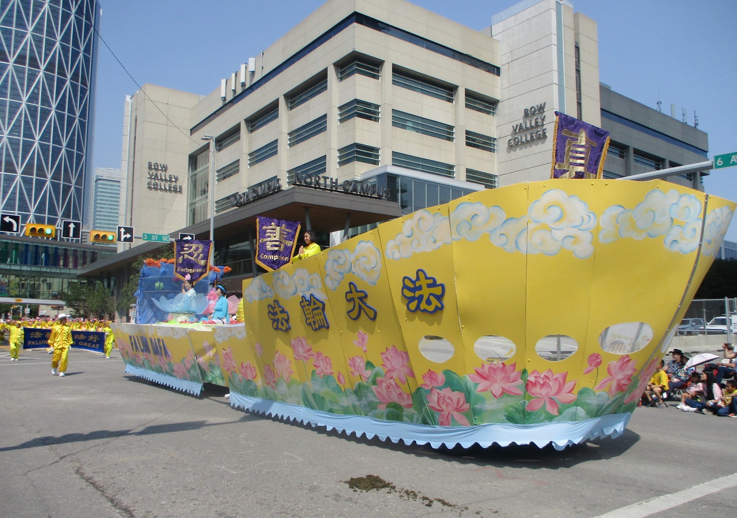 法轮大法队伍由三个队列组成,最前面为炼功队,向观众展示法轮功功法;中间是花车,造型为一艘巨大的金黄色法船,船体手绘蓝白祥云、粉莲碧荷,船上矗立“真、善、忍”三面旗帜,莲花台里端坐仙女;腰鼓队殿后,黄衣粉绸,踏着鼓点,奕奕而行。
