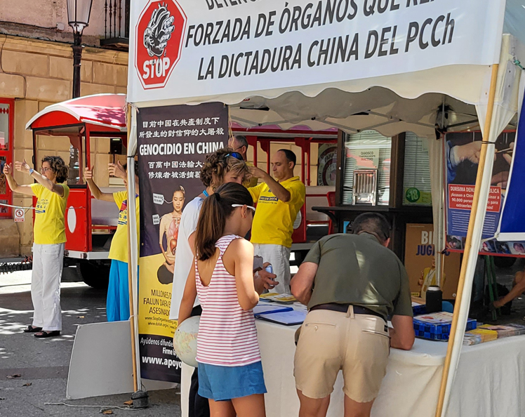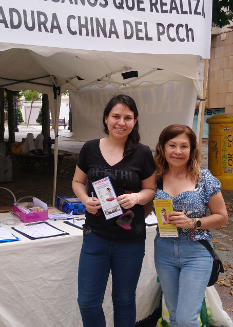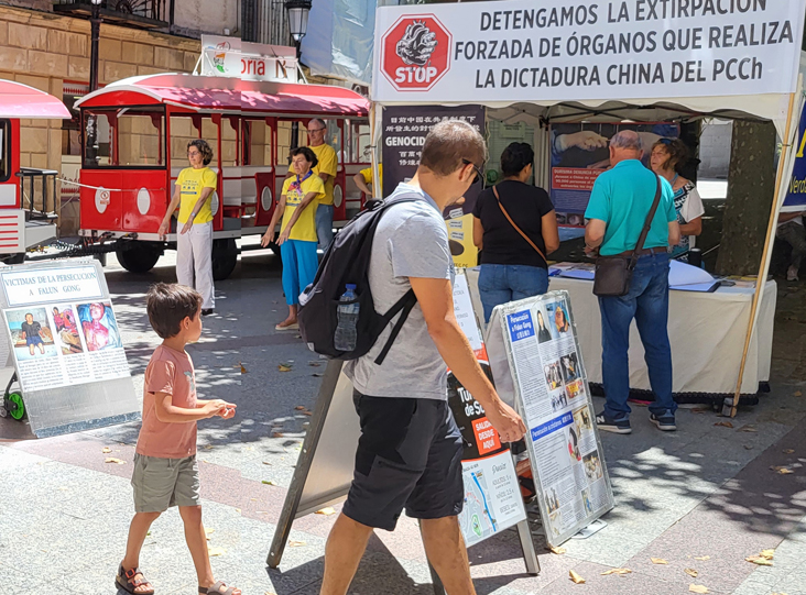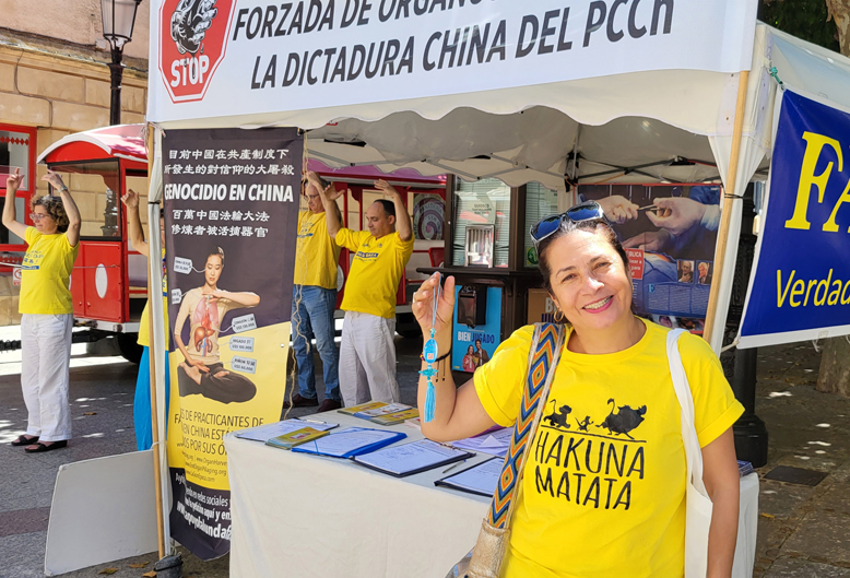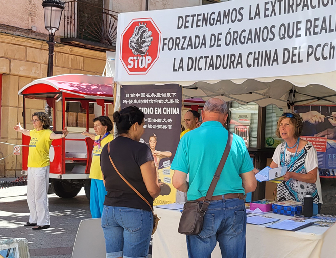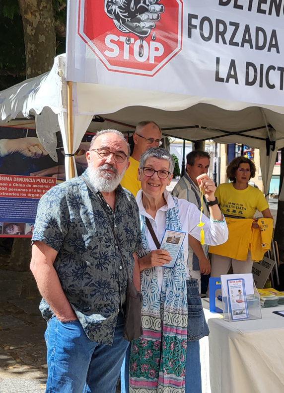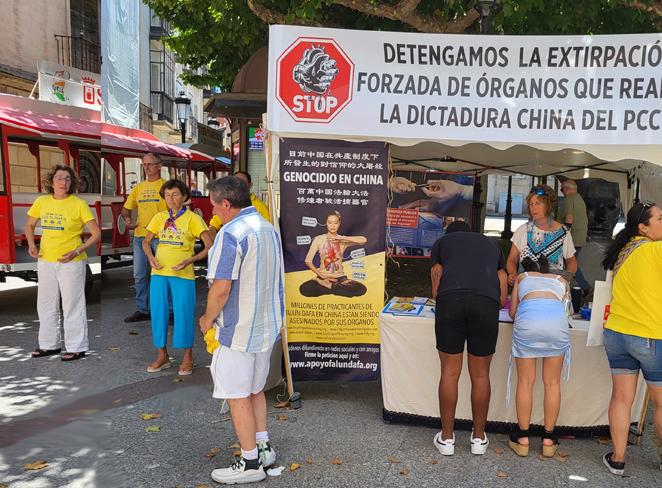 索里亚市当地居民罗拉(Lola)女士和哈伊姆(Jaime)先生是夫妻,他们被悠扬的炼功音乐所吸引,前来观看法轮功学员的功法演示,表示之前曾对中共迫害法轮功有所耳闻。他们询问学员迫害是否仍在持续。