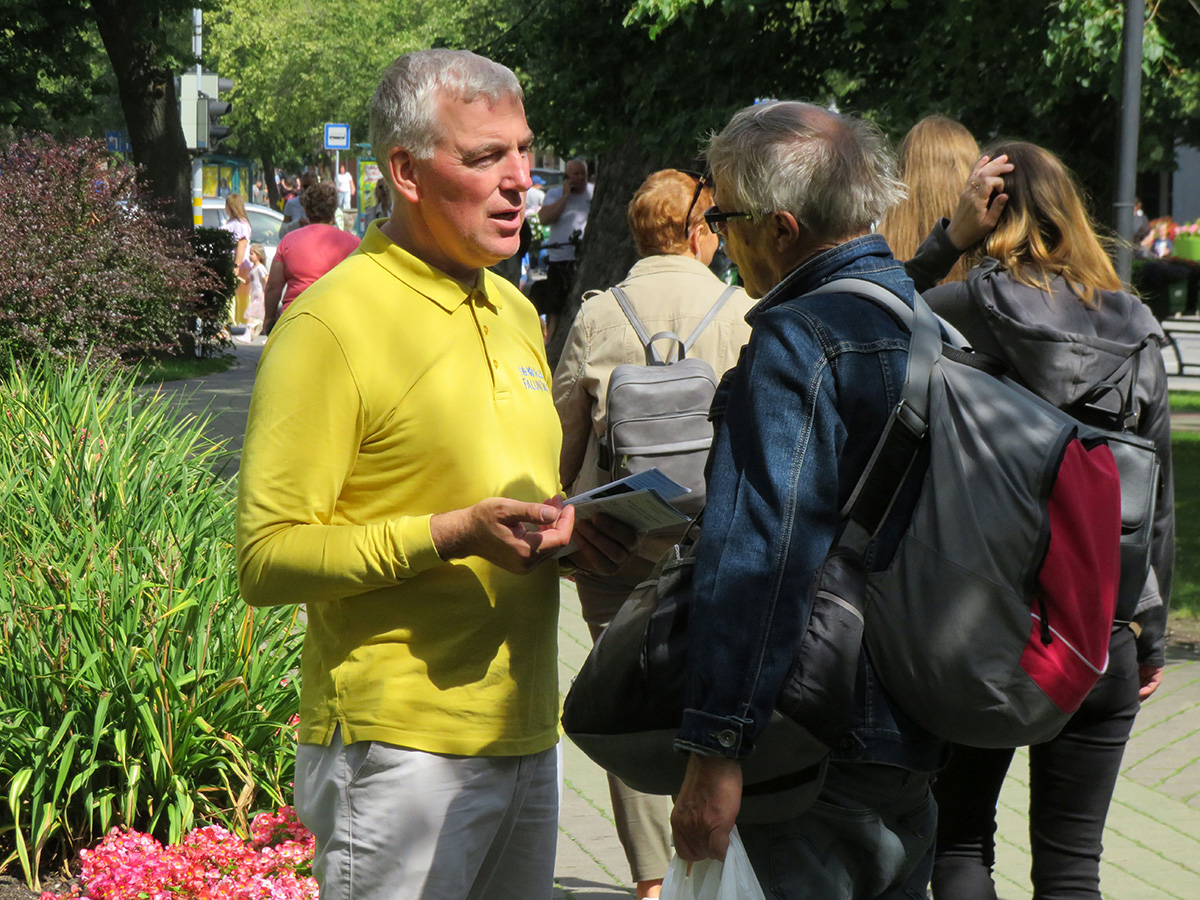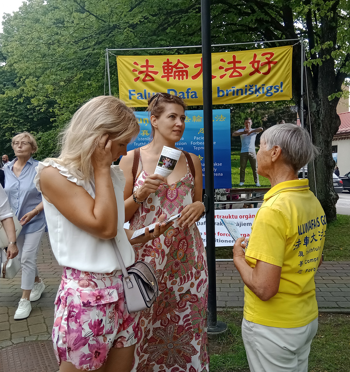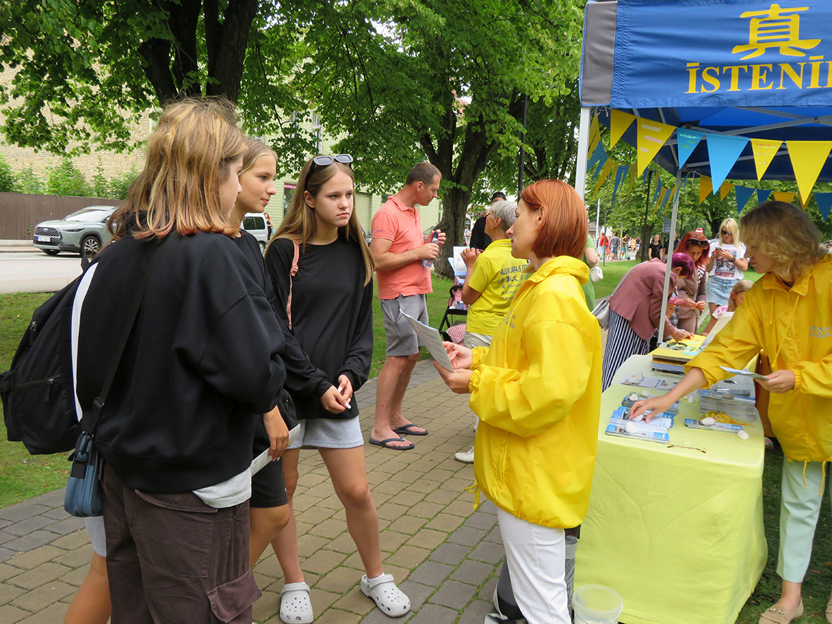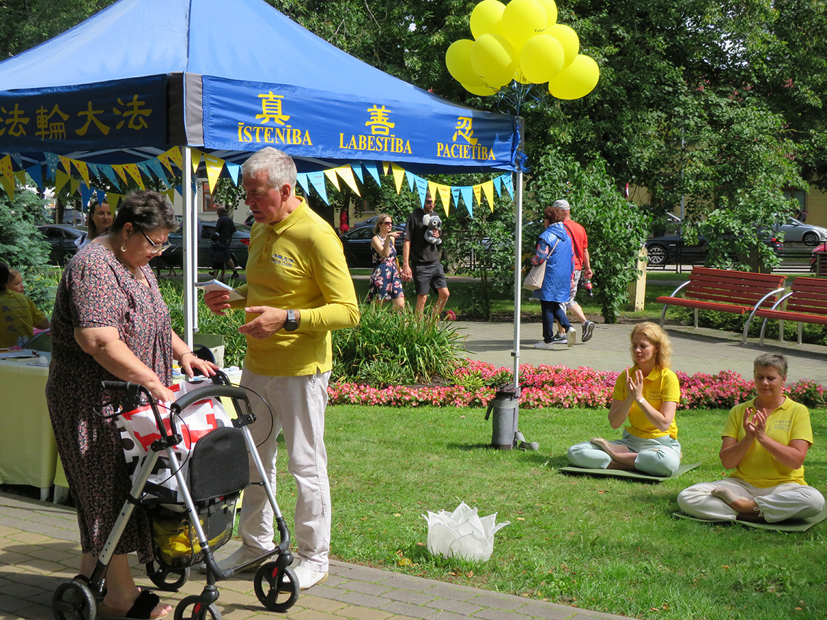 许多人对法轮大法传授的法理很感兴趣、他们询问在文斯特皮尔斯的炼功点的信息。学员们告诉他们,炼功时间是每周日上午九点半,地点是帕尔文塔(Parventa)的儿童公园范塔齐亚(Fantazija)。