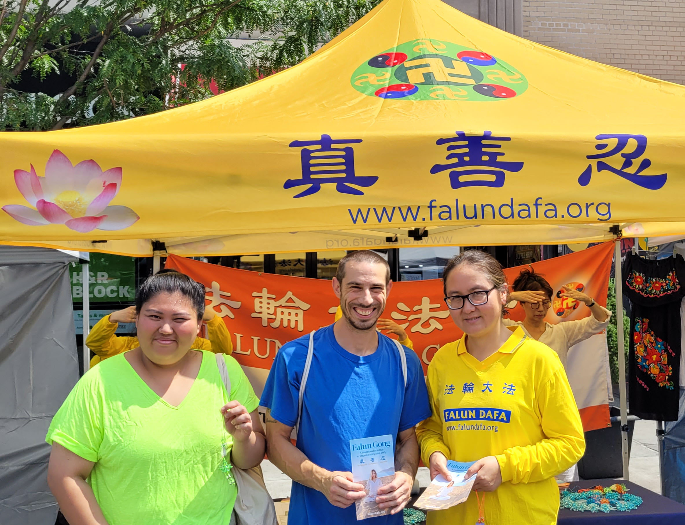 法布里斯(Fabrice)在附近的山谷银行(Valley Bank)工作。他今天出来走走,遇到了法轮功学员的展位就和他们聊了起来。法布里斯此前并不了解法轮大法,在听完介绍后,他觉得法轮大法非常好:“这是很好的锻炼方式,这么安静平和,追求道德(的提升)。这多好啊!”