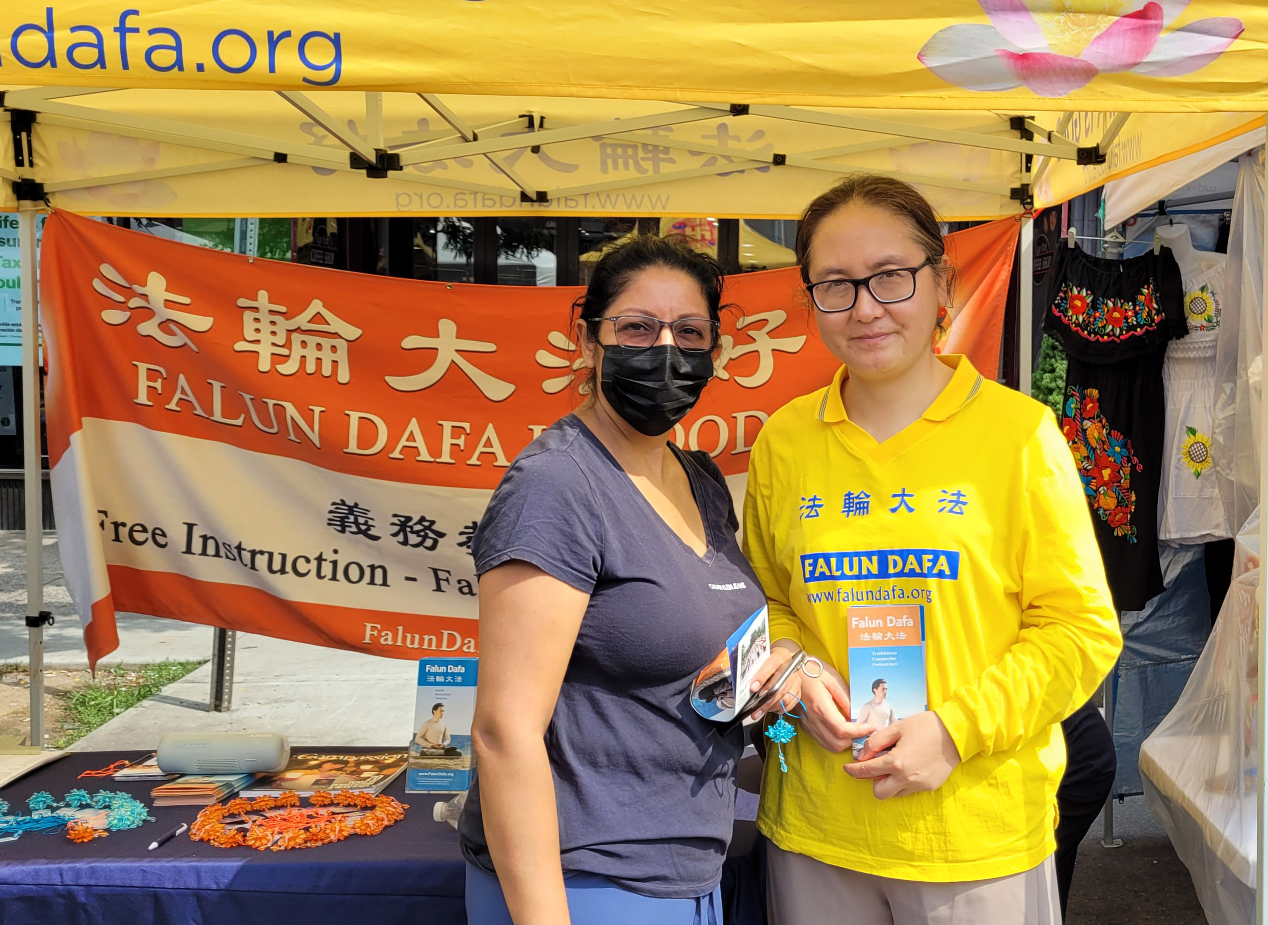附近的居民玛丽·贝斯(Mary)从事营销工作。她正在街道集市闲逛时,看到法轮功学员在炼功,还有法轮功学员向来往行人介绍法轮大法。在听完介绍之后,她很高兴发现了这么好的功法。