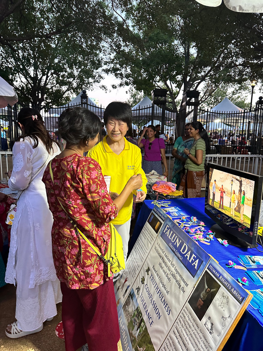 法轮功学员的摊位位于入口处的大树下,桌前摆放展板,桌后有学员演示法轮功功法。许多印度家庭一家人都前来了解真相,法轮功学员还赠送他们印有法轮大法信息的手工小莲花。