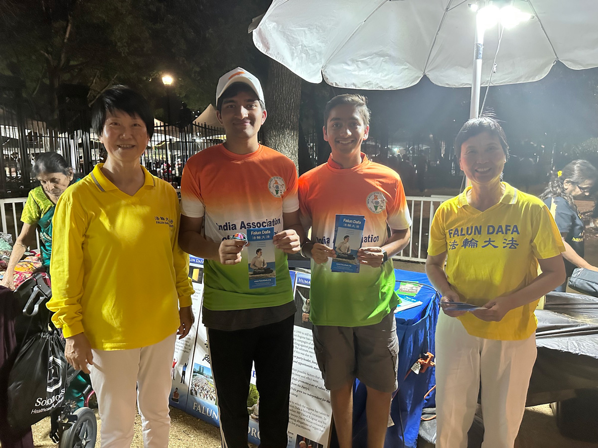 活动主办方的义工、两位印度裔高中生看见法轮功学员的真相摊位,十分欣喜,其中高个的学生说他的一个朋友炼,他从那里得知一些法轮功的情况,现在竟然在这里能遇见法轮功学员,很高兴。学员给他们俩介绍了法轮功是什么,当得知中共对善良无辜的法轮功学员的迫害,他们要求多拿一些传单,因为他们在这里工作,可以发给其他人,帮助传播法轮大法真相。最后,两人还在摊位前与两位法轮功学员合影。