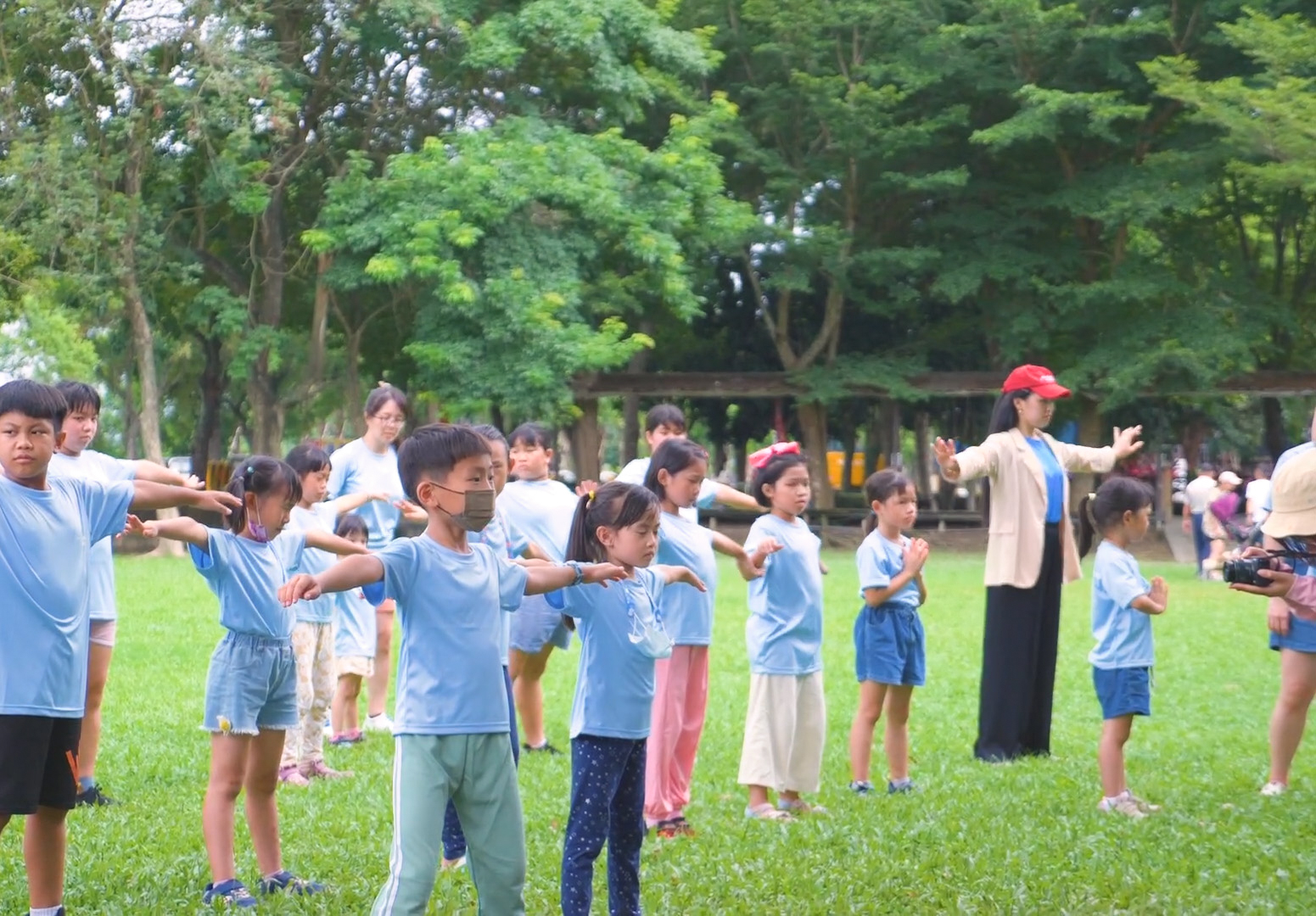 ![]() 图8~9:小朋友在云林优美的绿色隧道景点集体炼功。 |