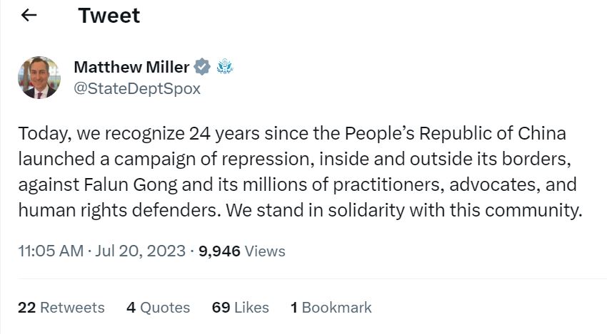 二零二三年七月二十日,美国国务院发言人马修·米勒(Matthew Miller)发表推文,声援法轮功学员。