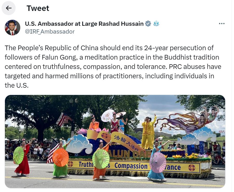 美国国际宗教自由大使拉沙德·侯赛因(Rashad Hussain)也在当天的推特上写道:“中华人民共和国(中共)应该停止对法轮功学员长达二十四年的迫害。法轮功是以真、善、忍为核心的佛家传统修炼方法。中华人民共和国(中共)针对性的迫害伤害了数百万修炼者,其中包括在美国的法轮功学员。”