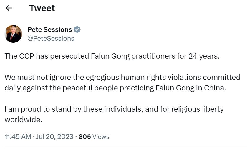 美国德州国会议员彼得·赛申斯(Pete Sessions)在七月二十日发表的推文说,“中共迫害法轮功学员已经二十四年了。我们绝不能忽视每天针对和平修炼法轮功的中国民众的严重侵犯人权行为。能够支持这些人,并支持全世界的宗教信仰自由,我感到自豪。”