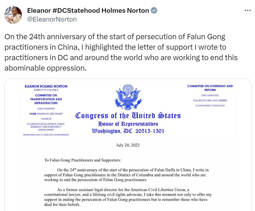 华盛顿特区国会众议员埃莉诺·霍姆斯·诺顿(Eleanor Holmes Norton)在七月二十日发表的推文说,在中共迫害法轮功学员二十四年之际,我写信支持首都华盛顿特区和世界各地的法轮功学员,他们正在努力制止对法轮功学员的迫害。