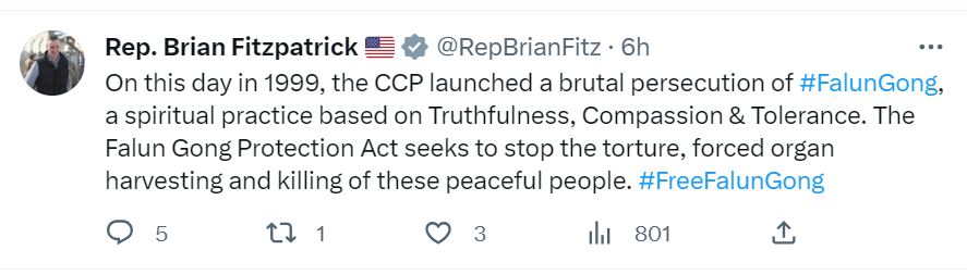 七月二十日,宾夕法尼亚国会众议员布莱恩·菲茨帕特里克(Brian Fitzpatrick)在推文中说,“一九九九年的今天,中共对法轮功发起了残酷的迫害,法轮功是基于真、善、忍的修炼。《法轮功保护法》(Falun Gong Protection Act)旨在制止对这些和平人士的酷刑、活摘器官和杀害。释放法轮功学员。”