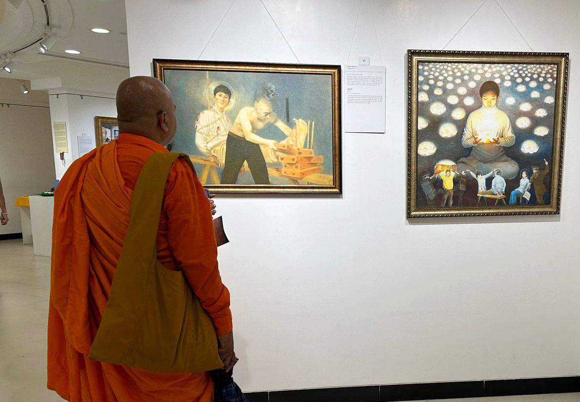 几位僧人也前来参观法轮功学员的作品。其中一位僧人表示他很高兴以艺术形式了解了法轮大法,他说:“我们几位僧人在四五年前在菩提伽耶了解了法轮大法,我们喜欢她,因为她是建立在真善忍原则基础上的。”