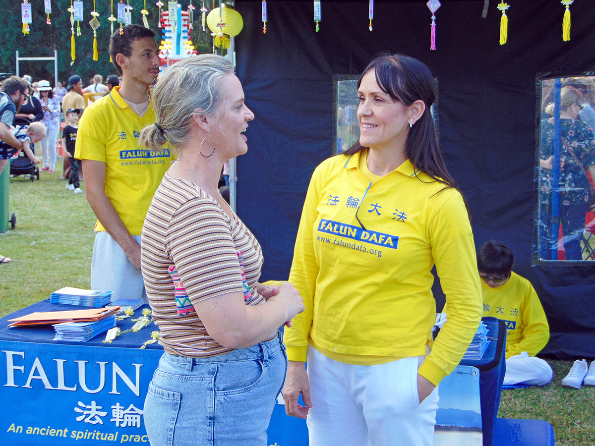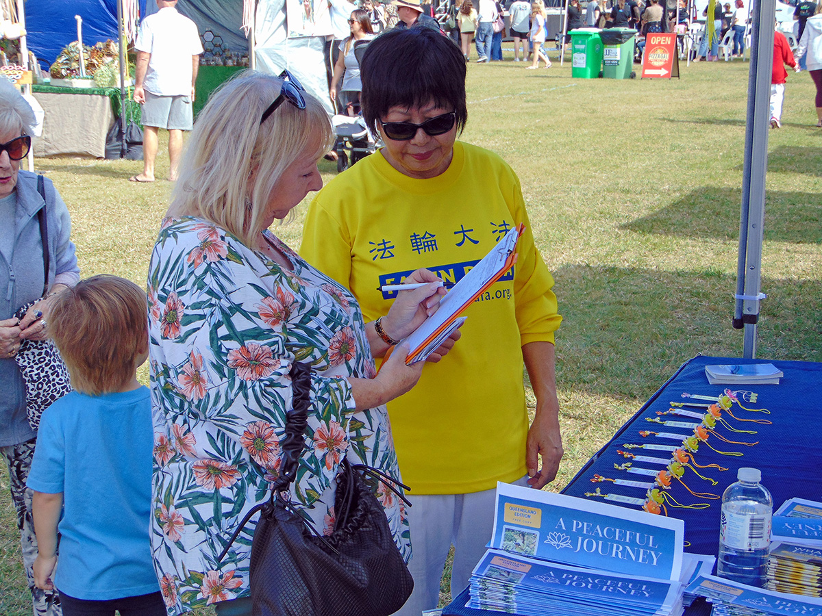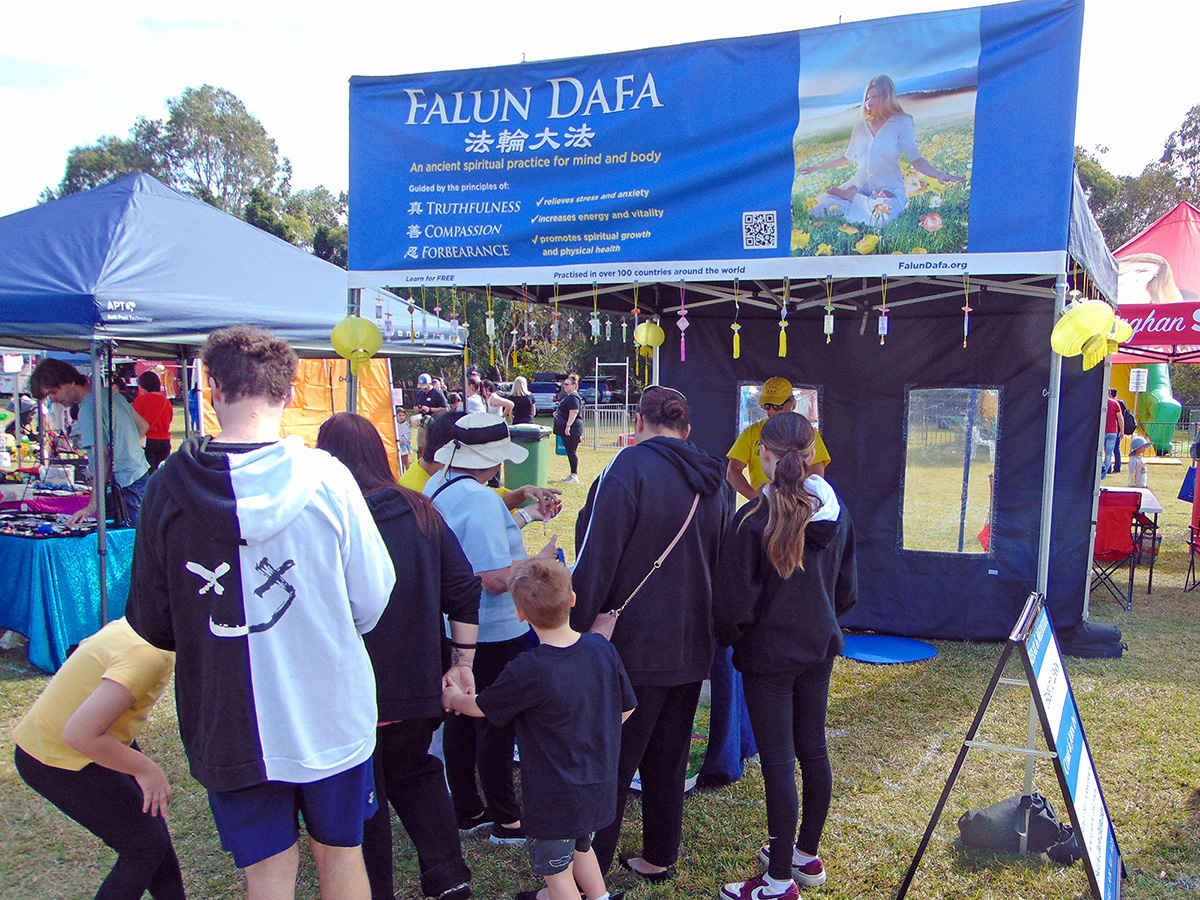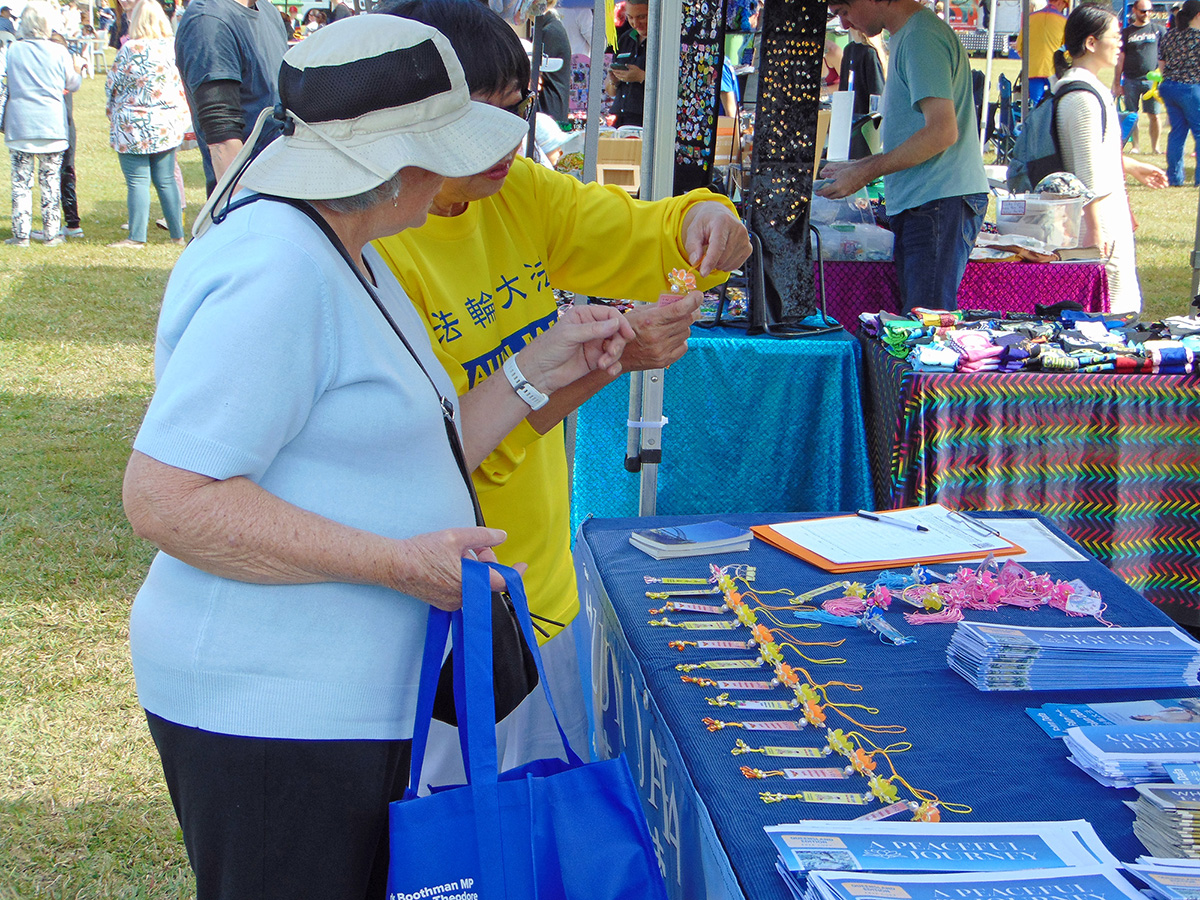 法轮功学员在活动中展示了祥和、舒缓的五套功法,许多人被吸引驻足观看,并和法轮功学员深入交谈,他们还接过真相传单和印有法轮大法信息的莲花。当雪莱(Shelley)了解到莲花代表修炼人的和平与纯洁时,她承诺将把莲花放在“心中的特殊位置上”。其中一些人还想知道在哪里可以学到祥和的法轮功修炼方法。