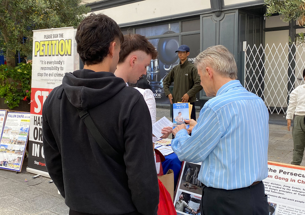 六、七位穿着得体的中年男士还没走到信息桌前,就停下了脚步,隔着几步距离看着展示功法的学员。学员看到后,热情地向他们问好,并快步走过去送上中文真相资料。学员向他们介绍这些人都是法轮功修炼者,法轮功是佛家功,现在已经弘传到一百多个国家,爱尔兰人也在炼法轮功。
