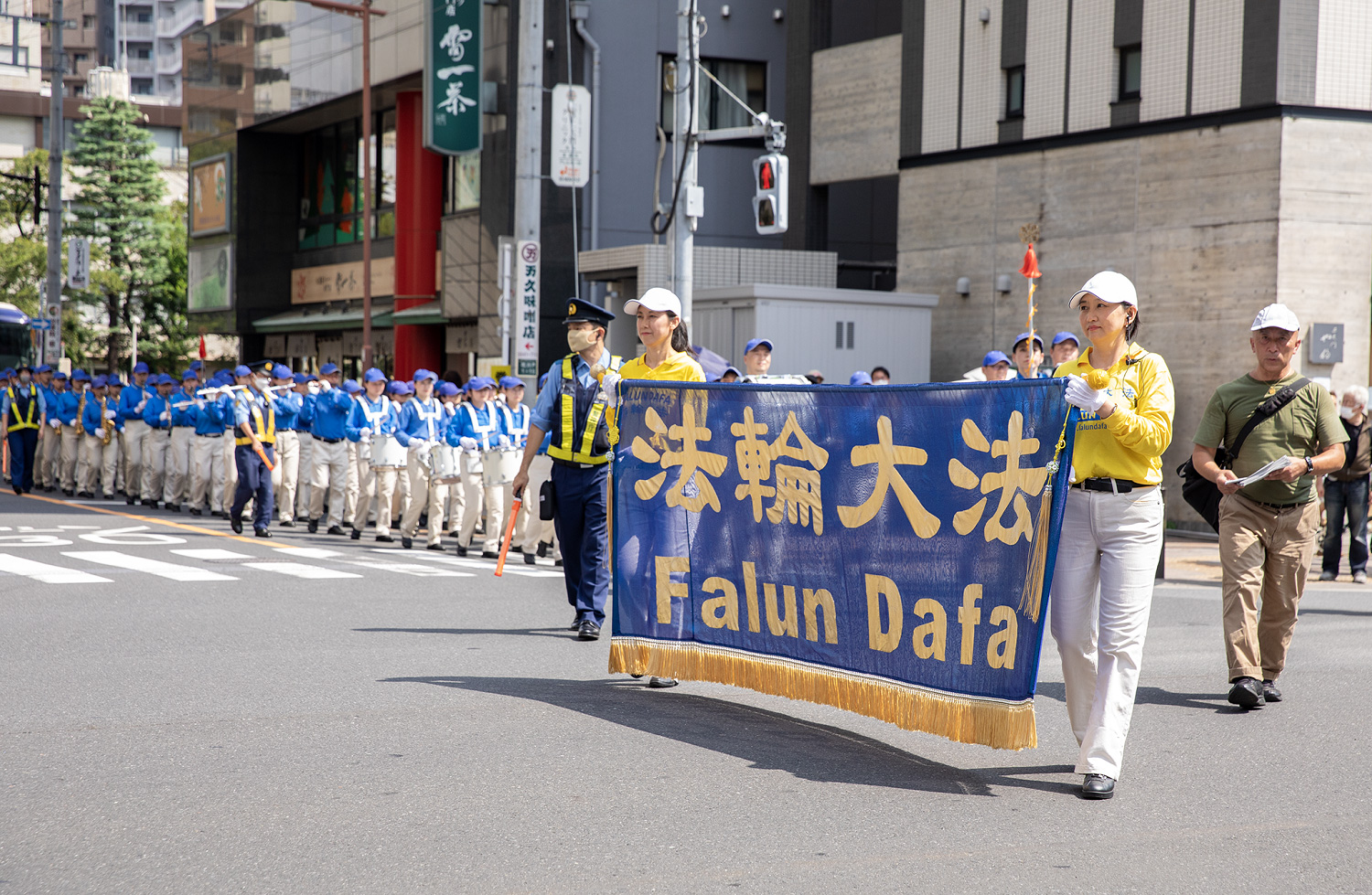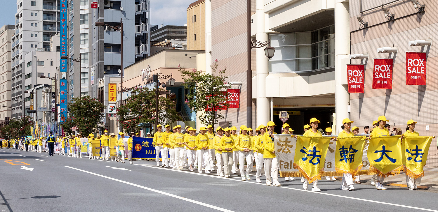 游行于下午一点半开始,从花川户公园出发,绕景点的大道一周又回到出发点,全程约一个半小时。游行队伍由警车开路,随后是威武雄壮的天国乐团,接着是手持各种真相横幅队伍缓缓前行,炼功队伍伴随着舒缓悠扬的炼功音乐,展示了法轮功祥和优美的功法动作。