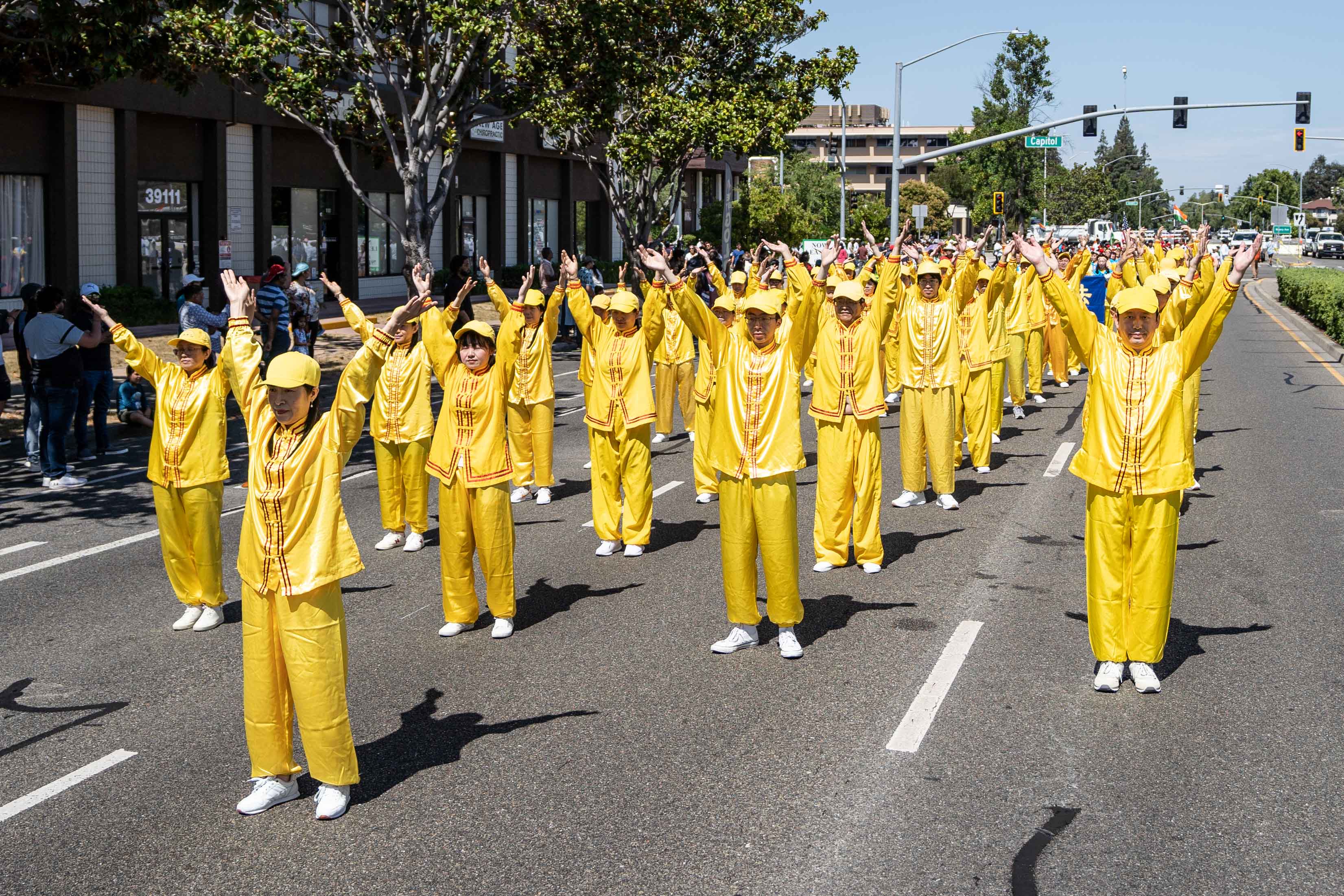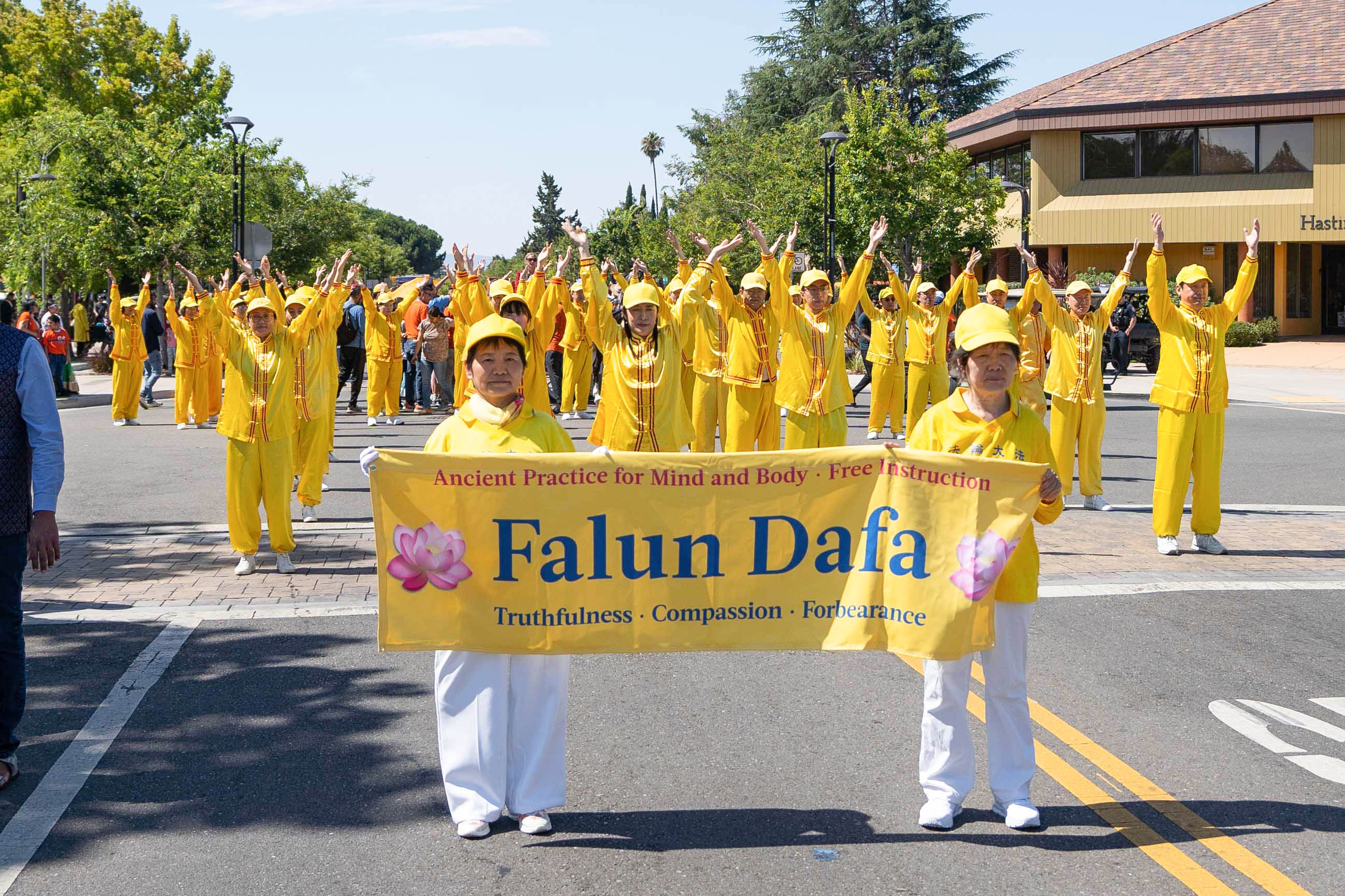 当法轮功学员的队伍经过主席台时,主持人向观众介绍说,“现在来的是法轮大法的队伍。法轮大法的原则是真、善、忍,法轮大法有五套缓慢圆的功法。每个人都可以学炼法轮功,而且修炼法轮大法是免费的。”