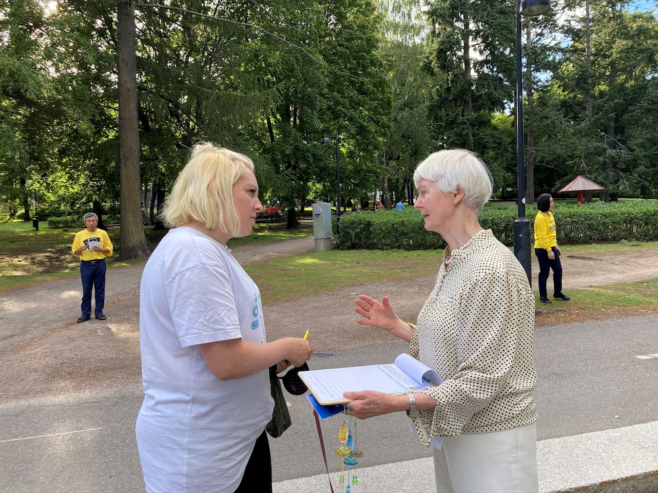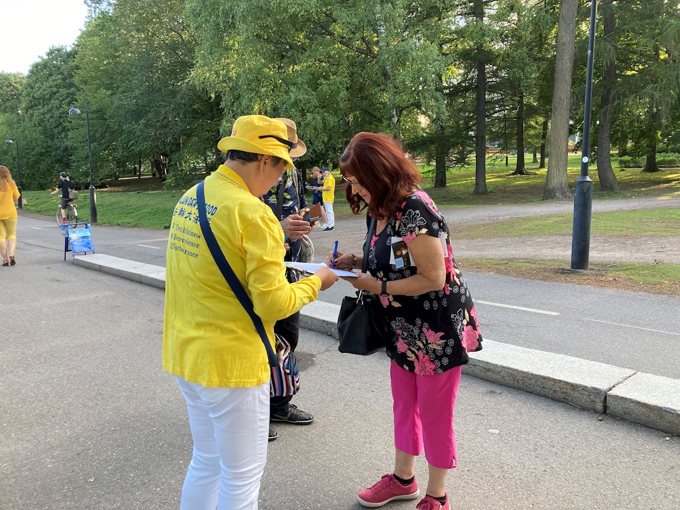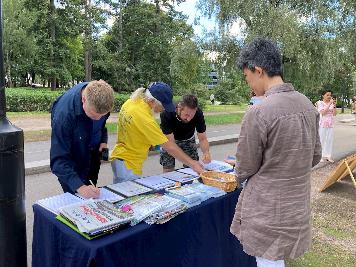 在赫尔辛基机场工作的劳拉说:“听了所有这些法轮功修炼者的故事,感到非常难过。我觉得修炼者们在这里所做的事情非常重要,而且我也相信因果报应。”她毫不犹豫地在请愿书上签名,并对学员送给她的精致莲花表示感谢。