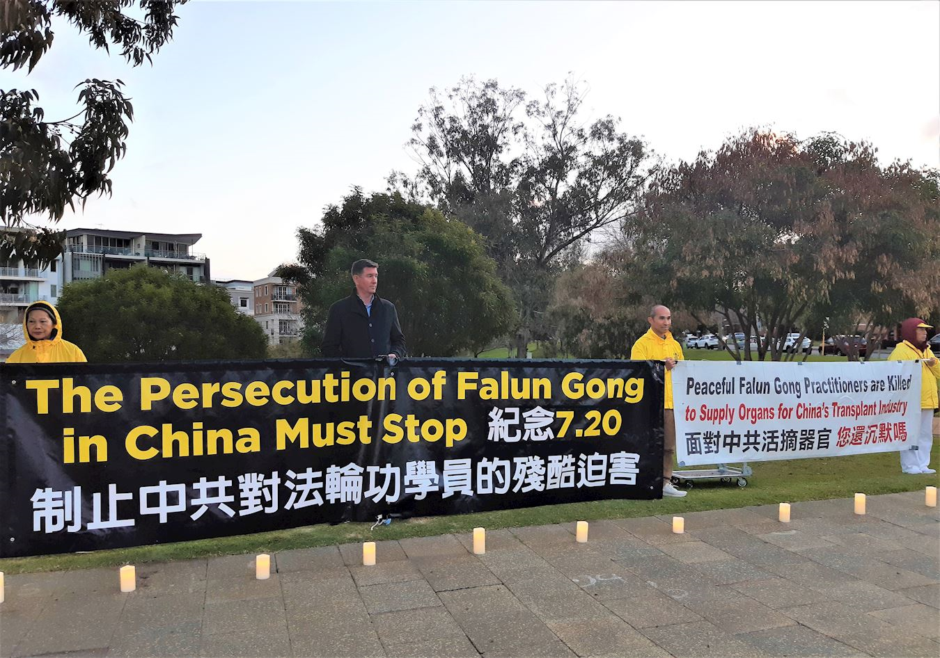 ![]() 图3:二零二三年七月十九日西澳法轮功学员在中领馆附近举行了烛光夜悼,悼念二十四年间被中共迫害致死的法轮功学员。左二为马克·哈奇森。 |