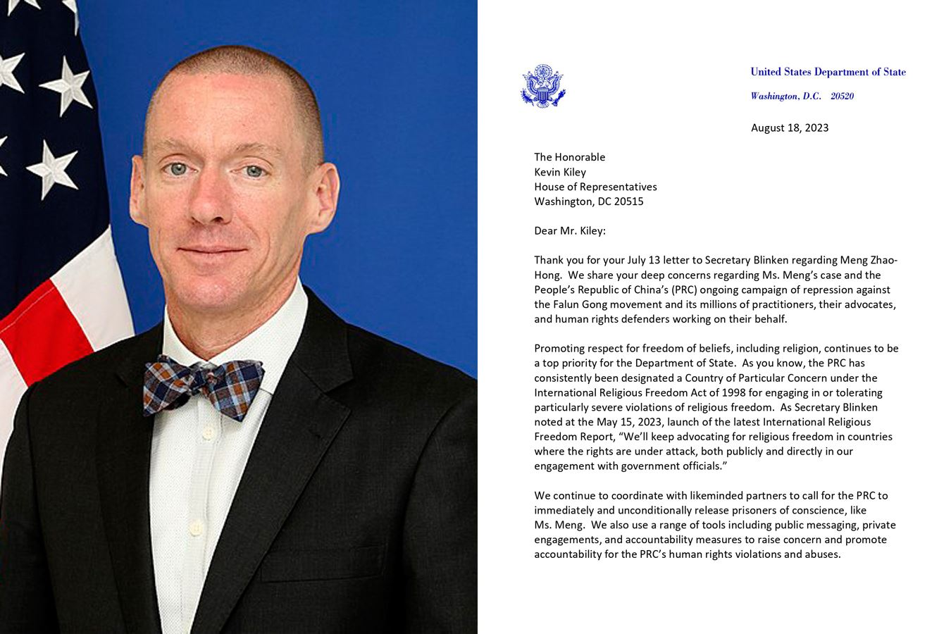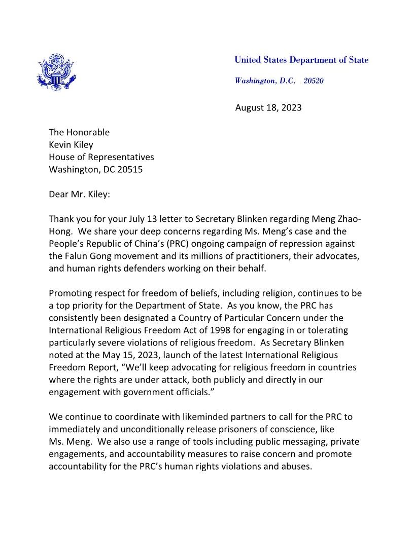 感谢您七月十三日就孟昭红被抓一事致函国务卿布林肯。我们与您一样对孟女士的案件以及中共持续迫害法轮功及其数以百万计的修炼者、倡导者,以及人权维护者深表关切。